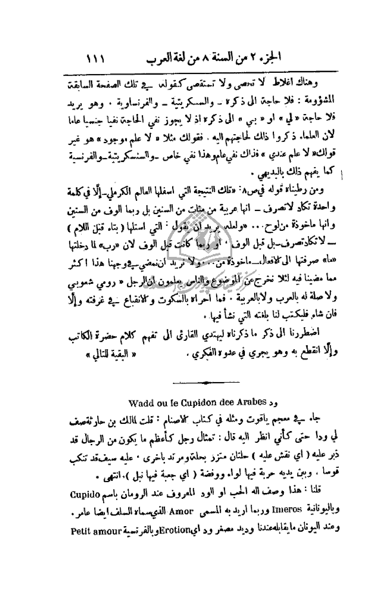 وهناك أغلاط لا تحصى ولا تستقصي كقوله في تلك الصفحة السابقة المشؤومة: فلا حاجة إلى ذكره - والسنكريتية - والفرنساوية. وهو يريد فلا حاجة (لي) أو (بي) إلى ذكره إذ لا يجوز نفي الحاجة نفياً جنسياً عاماً لأن العلماء ذكروا ذلك لحاجتهم إليه. فقولك مثلاً (لا علم موجود) هو غير قولك (لا علم عندي) فذاك نفي عام وهذا نفي خاص - والسنسكريتية - والفرنسية كما يفهم ذلك بالبديهي.