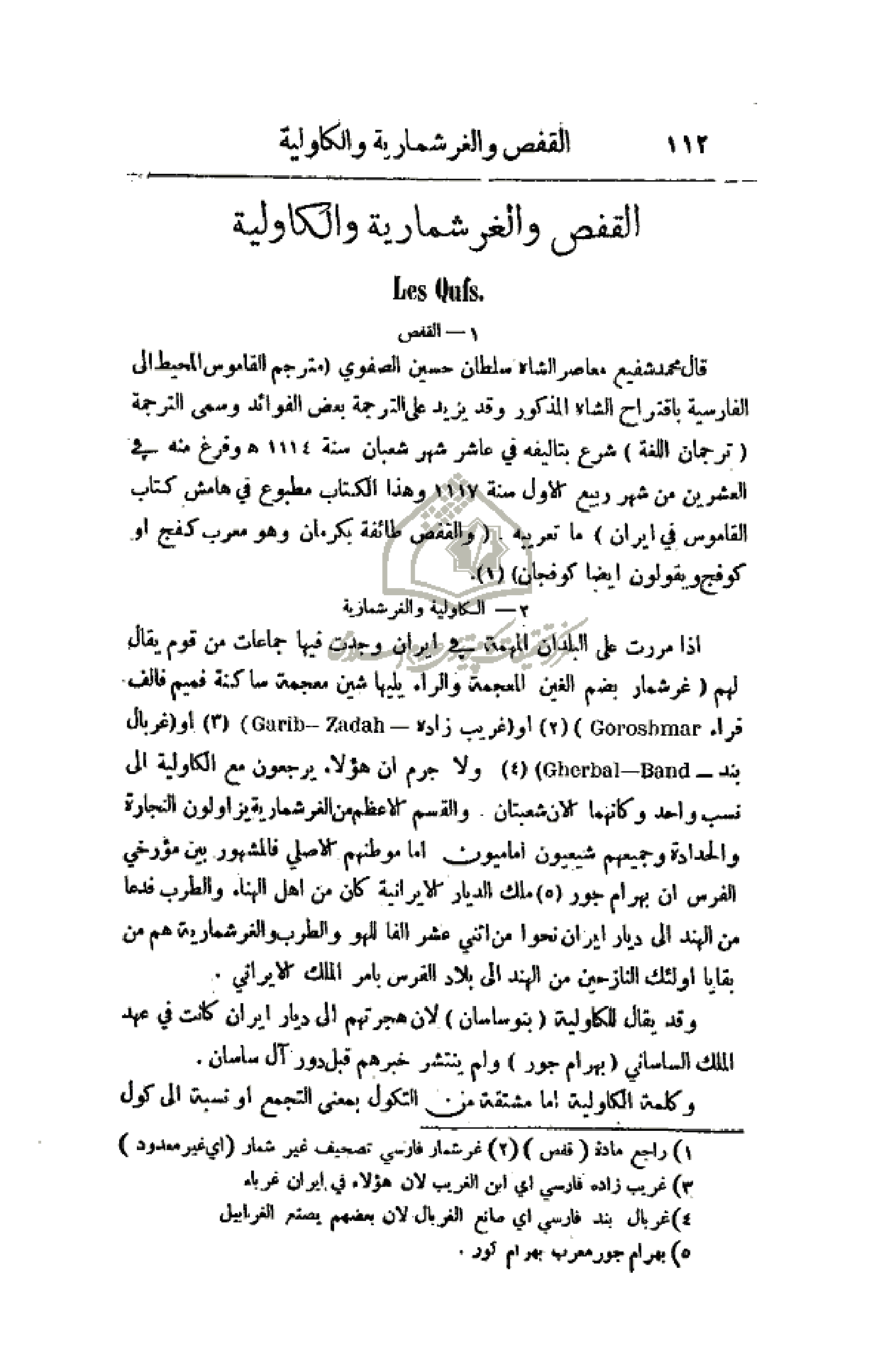 قال محمد شفيع معاصر الشاه سلطان حسين الصفوي (مترجم القاموس المحيط إلى الفارسية باقتراح الشاه المذكور وقد يزيد على الترجمة بعض الفوائد وسمى الترجمة (ترجمان اللغة) شرع بتأليفه في عاشر شهر شعبان سنة 1114هـ وفرغ منه في العشرين من شهر ربيع الأول سنة 1117 وهذا الكتاب مطبوع في هامش كتاب القاموس في إيران) ما تعريبه: (والقفص طائفة بكرمان وهو معرب كفج أو كوفج ويقولون أيضاً كوفجان).
