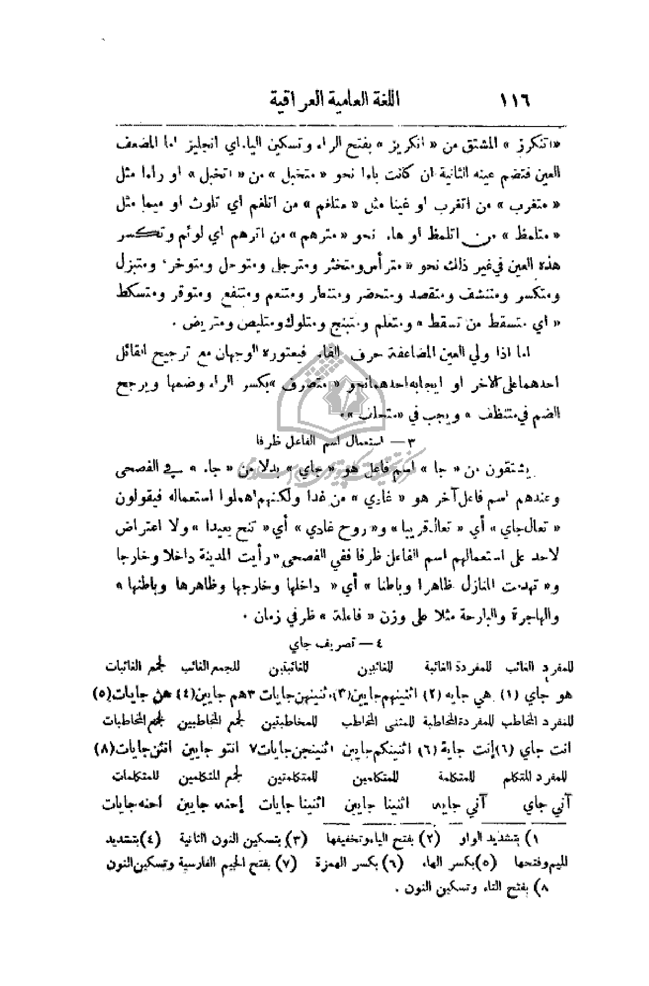 للمفرد الغائب للمفردة الغائية للغائبين للغائبتين للجمع الغائب لجمع الغائبات هو جاي هي جاية أثنينهم جايين اثنينهن جايات (3) هم جايين هن جايات للمفرد المخاطب للمفرد المخاطبة للمثنى المخاطب للمخاطبتين لجمع المخاطبات أنت جاي (6) إنت جاية أثنينكم جايين أثنينجن جايات انتو جايين أنتن جايات للمفرد المتكلم للمتكلمة للمتكلمين للمتكلمتين لجمع المتكلمين للمتكلمات أني جاي أني جاية أثنينا جايين أثنينا جايات إحنه جايين أحنه جايات.