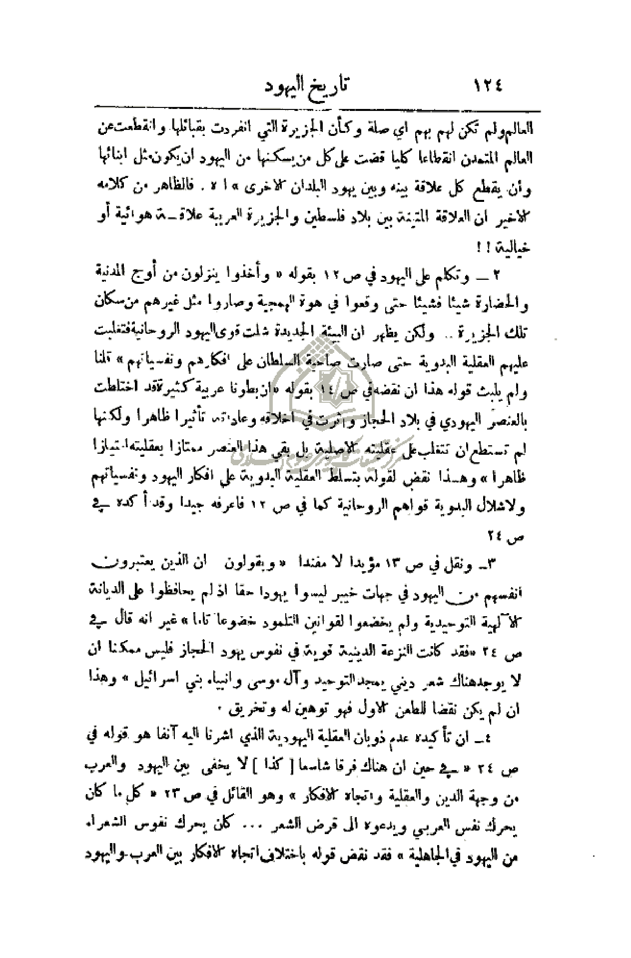 2 - وتكلم على اليهود في ص 12 بقوله (وأخذوا ينزلون من أوج المدينة والحضارة شيئاً فشيئاً حتى وقعوا في هوة الهمجية وصاروا مثل غيرهم من سكان تلك الجزيرة. . ولكن يظهر أن البيئة الجديدة شلت قوى اليهود الروحانية فتغلبت عليهم العقلية البدوية حتى