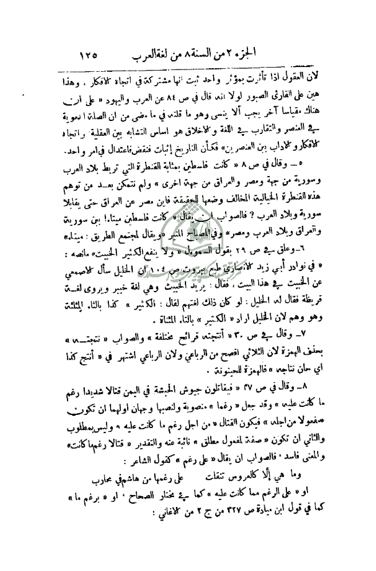 5 - وقال في ص 8 (كانت فلسطين بمثابة القنطرة التي تربط بلاد العرب وسورية من جهة ومصر والعراق من جهة أخرى) ولم نتمكن بعد من توهم هذه القنطرة الخيالية المخالف وضعها للحقيقة فأين مصر عن العراق حتى يقابلا سورية وبلاد العرب؟ فالصواب أن يقال (كانت فلسطين ميتاءاً بين سورية والعراق وبلاد العرب ومصر) وفي المصباح المنير (ويقال لمجتمع الطريق: ميتاء).