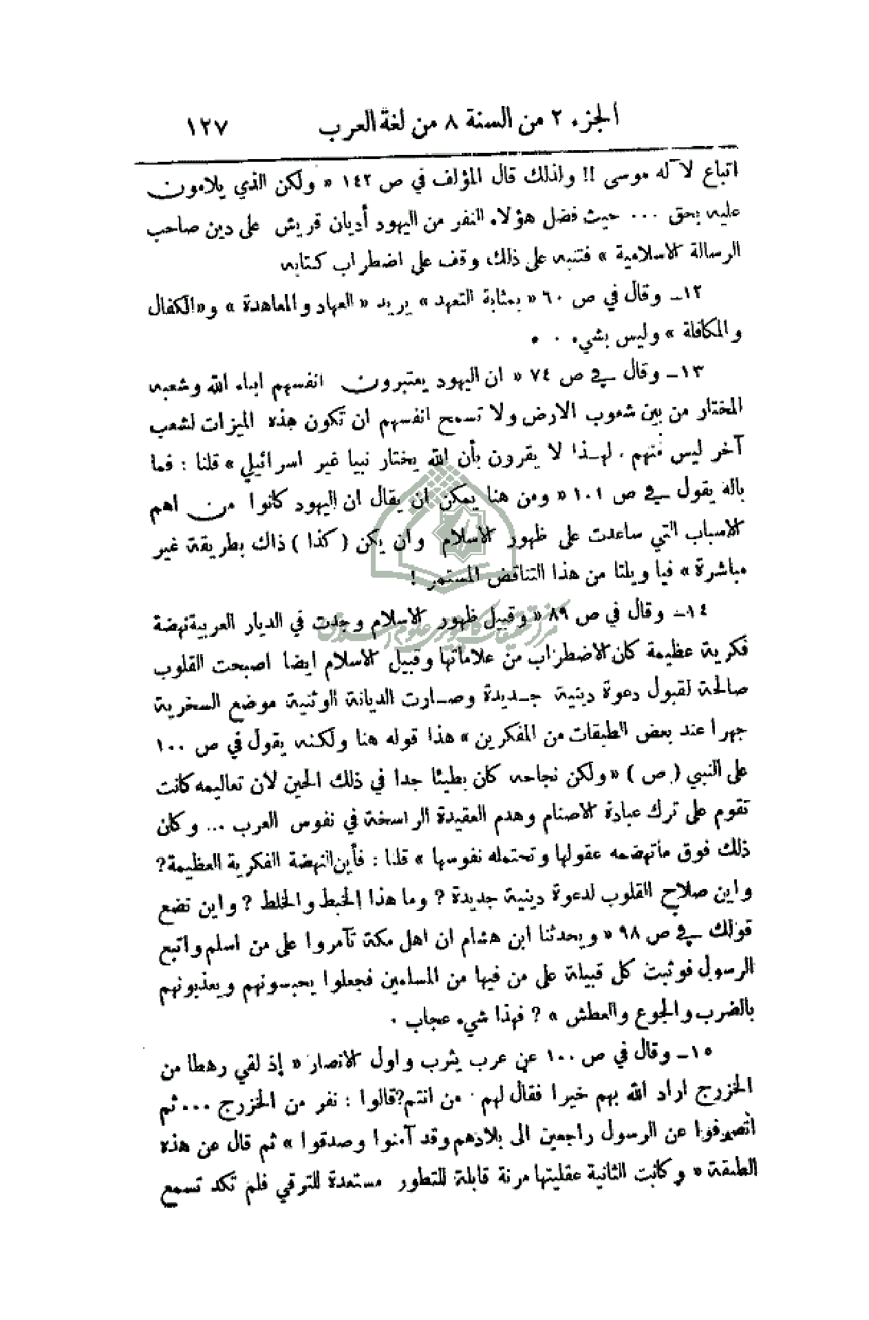 13 - وقال في ص 74 (أن اليهود يعتبرون أنفسهم أبناء الله وشعبه المختار من بين شعوب الأرض ولا تسمح أنفسهم أن تكون هذه الميزات لشعب آخر ليس منهم، لهذا لا يقرون بأن الله يختار نبياً غير إسرائيلي) قلنا: فما باله يقول في ص 101 (ومن هنا يمكن أن يقال أن اليهود كانوا من أهم السباب التي ساعدت على ظهور الإسلام وأن يكن (كذا) ذاك بطريقة غير مباشرة) فيا ويلتا من هذا التناقض المستمر!