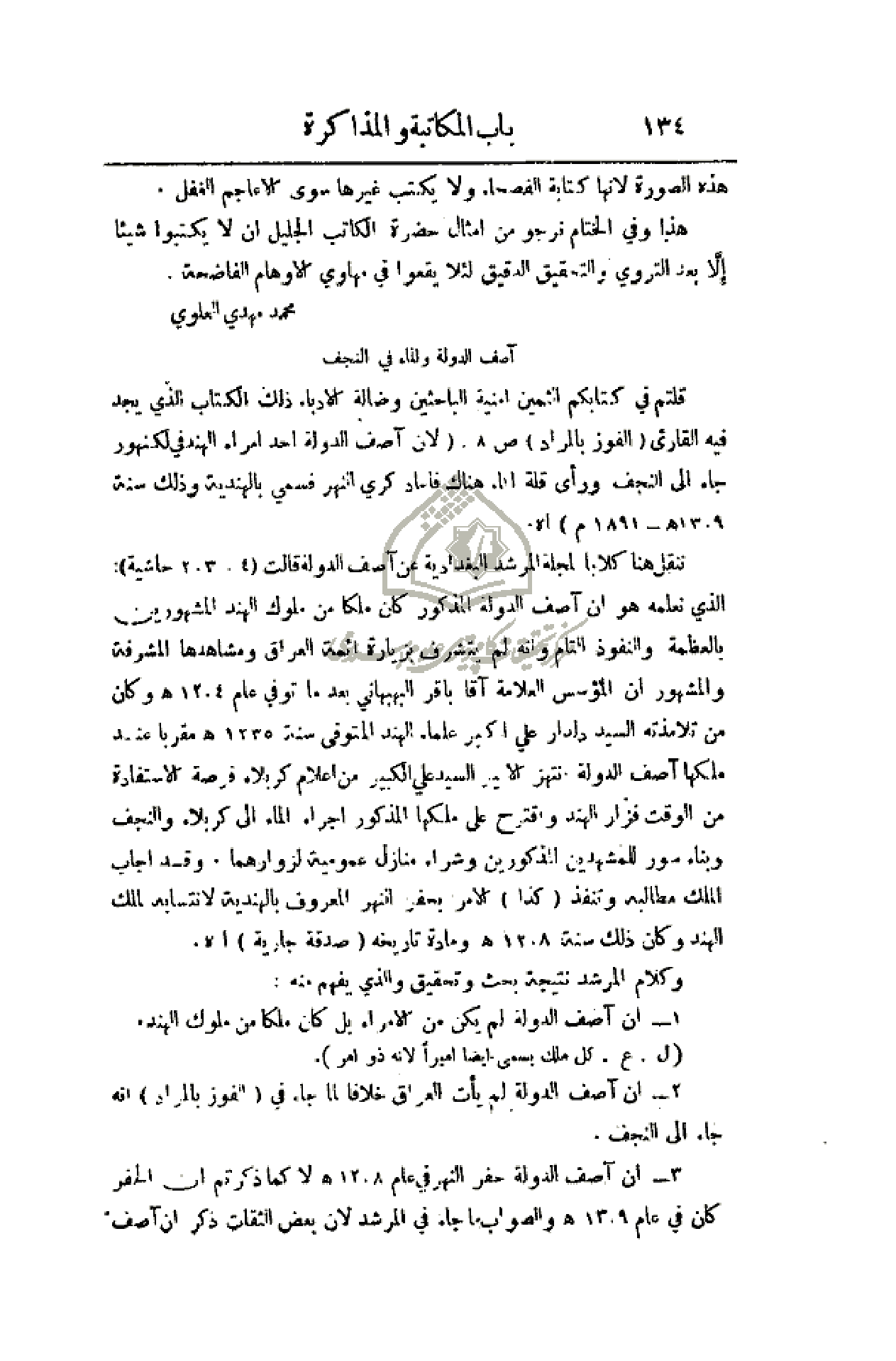 قلتم في كتابكم الثمين أمنية الباحثين وضالة الأدباء ذلك الكتاب الذي يجد فيه القارئ (الفوز بالمراد) ص 8. (لأن أصف الدولة أحد أمراء الهند في لكنهور جاء إلى النجف ورأى قلة الماء هناك فأعاد كري النهر فسمى بالهندية وذلك سنة 1309هـ - 1891م) أه.