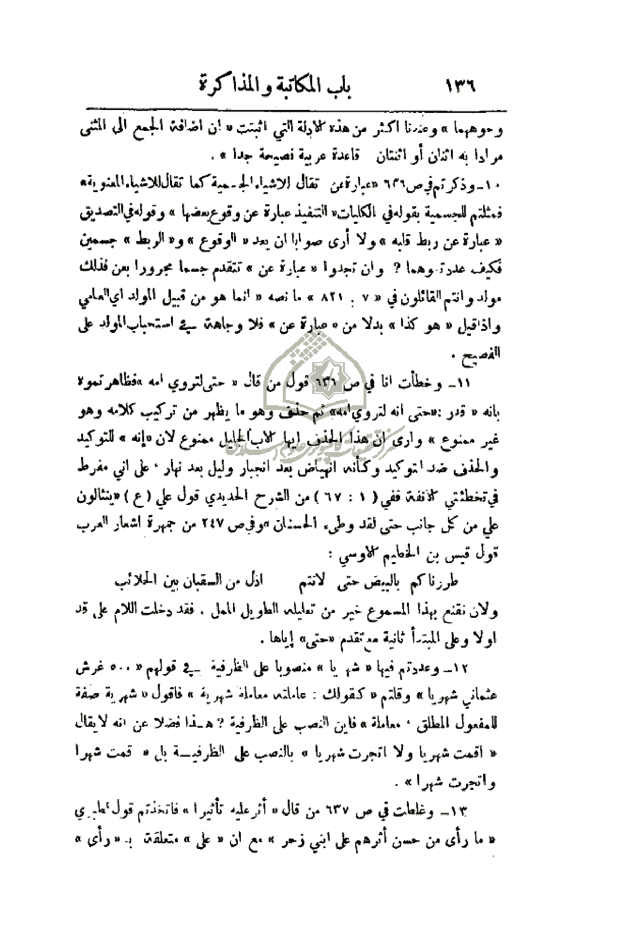 11 - وخطأت أنا في ص 636 قول من قال (حتى لتروى أمه) فظاهر تموه بأنه (قدر: (حتى أنه لتروي أمه) ثم حذف وهو ما يظهر من تركيب كلامه وهو غير ممنوع) وأرى أن هذا الحذف أيها الأب الجليل ممنوع لأن (إنه) للتوكيد والحذف ضد لتوكيد وكأنه انهياض بعد انجبار وليل بعد نهار. على أني مفرط في تخطئتي الأنفة ففي (1: 67) من الشرح الحديدي قول علي (ع) (ينثالون علي من كل جانب حتى لقد وطئ الحسنان) وفي ص 247 من جمهرة أشعار العرب قول قيس بن الخطيم الأوسي: