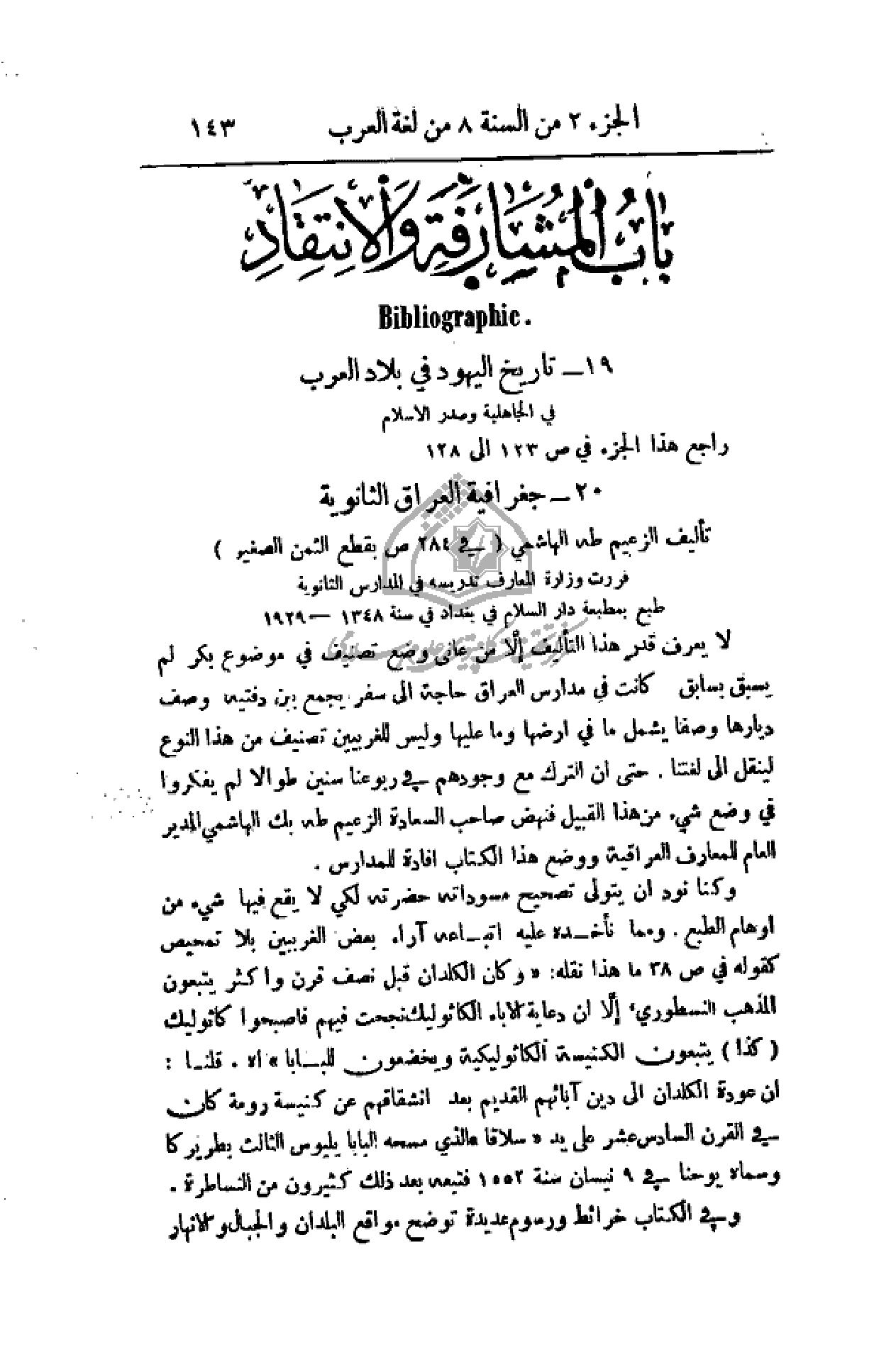 لا يعرف قدر هذا التأليف إلا من عانى وضع تصنيف في موضع بكر لم يسبق بسابق. كانت في مدارس العراق حاجة إلى سفر يجمع بين دفتيه وصف ديارها وصفاً ما في أرضها وليس للغربيين تصنيف من هذا النوع لينقل إلى لغتنا. حتى أن الترك مع وجودهم في ربوعنا سنين طوالاً لم يفكروا في وضع شيء من هذا القبيل صاحب السعادة الزعيم طه بك الهاشمي المدير العام للمعارف العراقية ووضع هذا الكتاب إفادة للمدارس.
