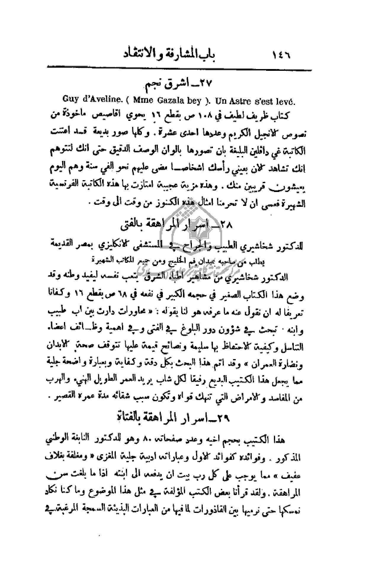 هذا الكتيب بحجم أخيه وعدد صفحاته 80 وهو للدكتور النابغة الوطني المذكور. وفوائده كفوائد الأول وعباراته أدبية جلية المغزى (ومغلفة بغلاف عفيف) مما يوجب على كل رب بيت أن يدفعه إلى أبنته إذا ما بلغت سن المراهقة. ولقد قرأنا بعض الكتب المؤلفة في مثل هذا الموضوع وما كنا نكاد نمسكها حتى نرميها بين القاذورات لما فيها من العبارات البذيئة السمحة المرغبة في