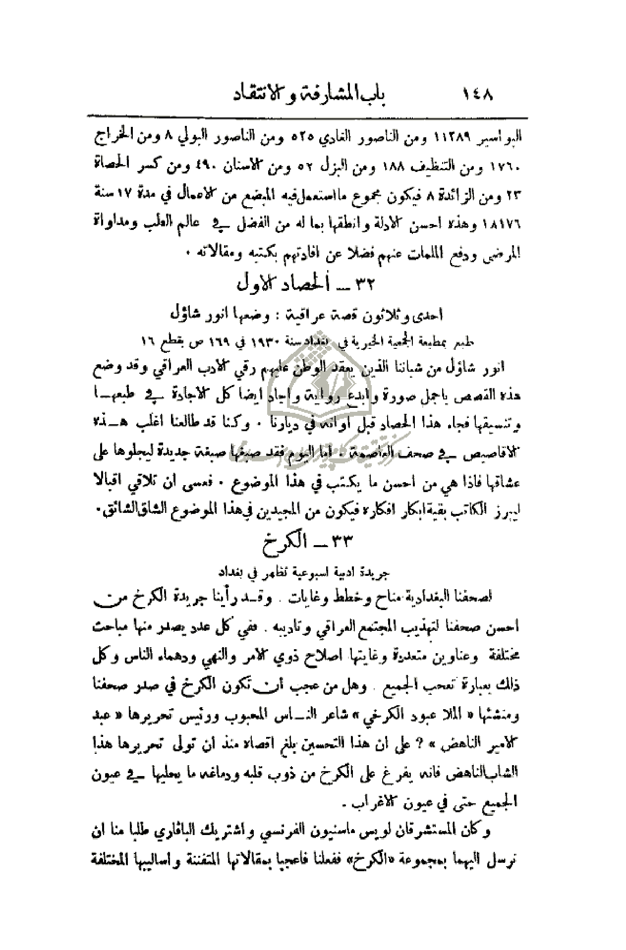 وكان المستشرقان لويس ماسنيون الفرنسي وأشتريك البافاري طالبا منا أن نرسل إليهما بمجموعة (الكرخ) ففعلنا فأعجبا بمقالاتها المتفننة وأساليبها المختلفة