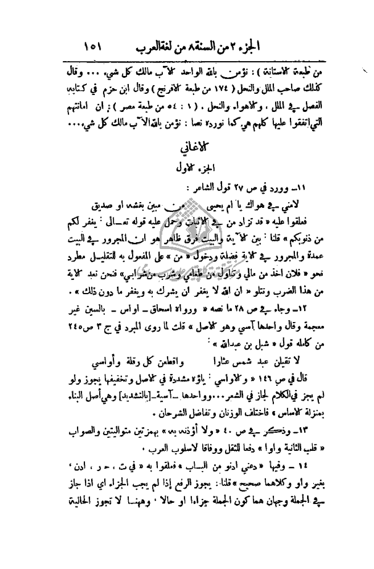 12 - وجاء في ص 28 ما نصه (ورواه أسحاق - أواس - بالسين غير معجمة وقال وأحدها آسي وهو الأصل) قلت لما روى المبرد في ج 3 ص 245 من كاملة قول (شبل بن عبد الله):