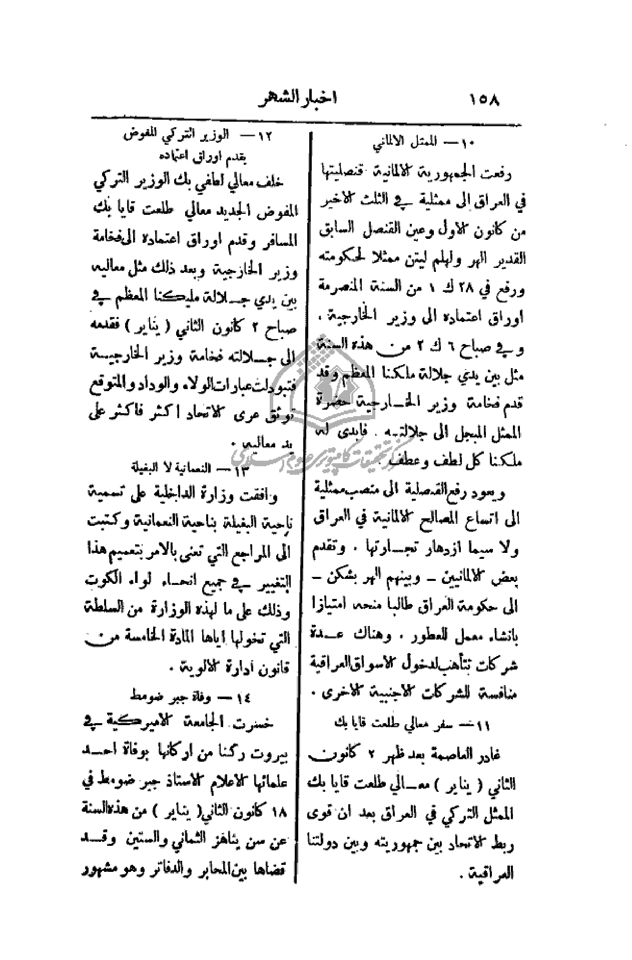 رفعت الجمهورية الألمانية قنصليتها في العراق إلى ممثليه في الثلث الأخير من كانون الأول وعين القنصل السابق القدير الهر ولهلم ليتن ممثلاً الحكومته ورفع في 28 ك 1 من السنة المنصرمة أوراق اعتماده إلى وزير الخارجية، وفي صباح 6 ك 2 من هذه السنة مثل بين يدي جلالة ملكنا المعظم وقد قدم فخامة وزير الخارجية حضرة الممثل المبجل إلى جلالته فأبدى له ملكنا كل لطف وعطف.