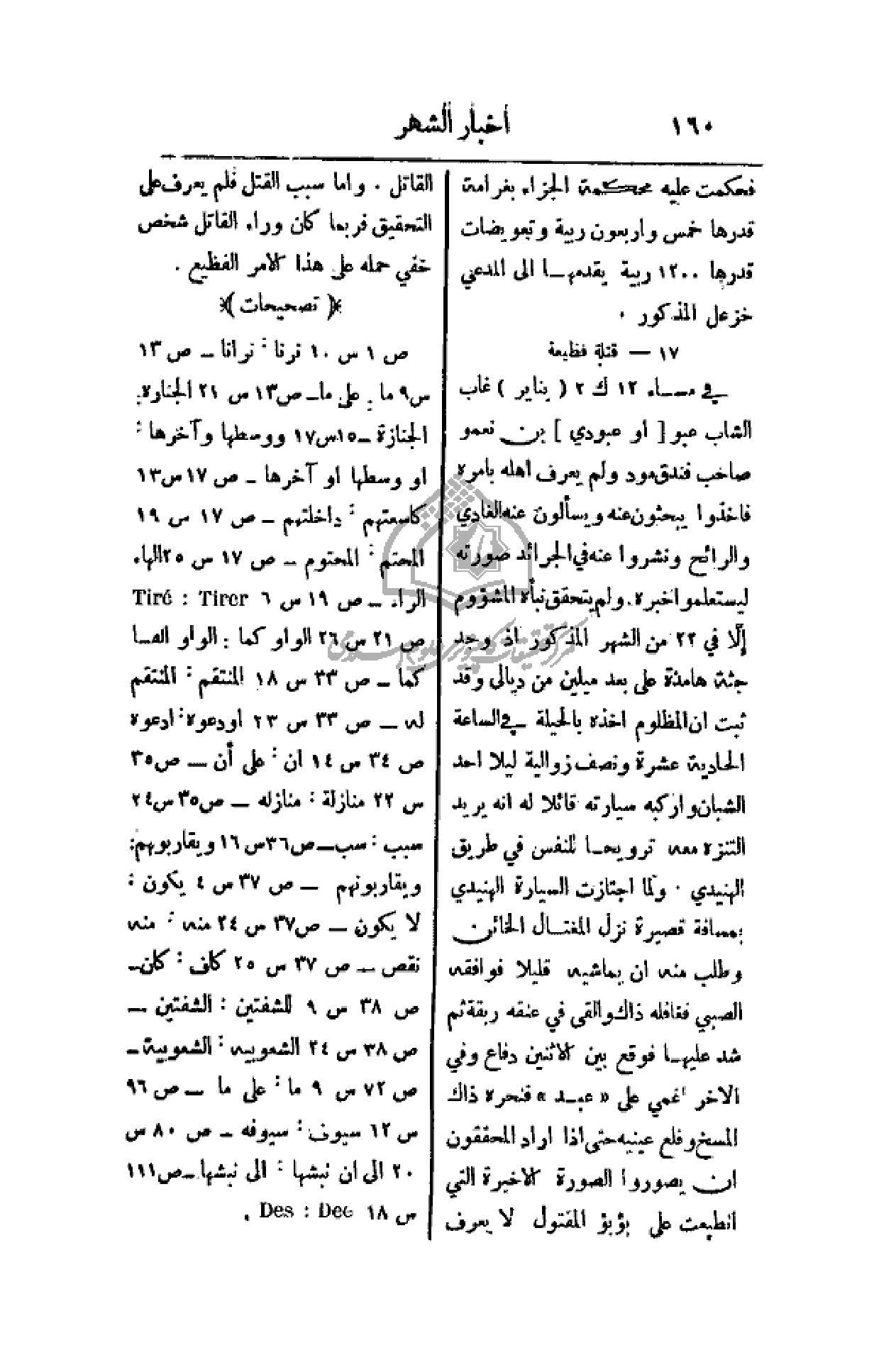 الجنازة - 15 س 17 ووسطها وآخرها: أو وسطها أو آخرها - ص 17 س 13 كاسعتهم: داخلتهم - ص 17 س 19 المحتم: المحتوم - ص 17 س 25 الهاء: الراء - ص 19 س 6 - ص 21 س 26 الواو كما: الواو ألفا كما - ص 33 س 18 المنتقم: المنتقم له - ص 33 س 23 أودعوه: أدعوه - ص 34 س 14 أن: على أن - ص 35 س 22 منازلة: منازلة - ص 35 س 24 سبب: سب - ص 36 س 16 ويقاربوهم: ويقاربونهم - ص 37 س 4 يكون: لا يكون - ص 37 من 24 منه: منه نقص - ص 37 س 25 كاف: كان - ص 38 س 9 للشفتين: الشفتين - ص 38 س 24 الشعوبية: الشعوبية - ص 72 س 9 ما: على ما - ص 96 س 12 سيوف: سيوفه - ص 80 س 20 إلى أن نبشها: إلى نبشها - ص 111 س 18
