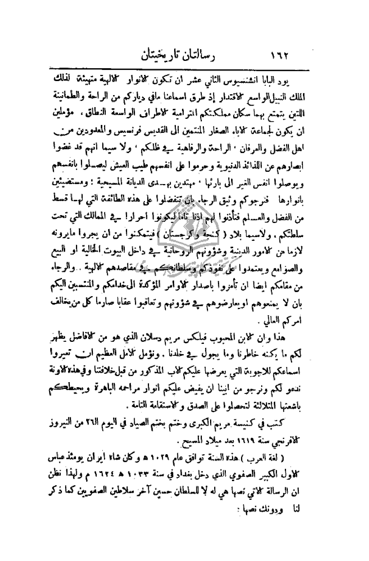 (لغة العرب) هذه السنة توافق عام 1029هـ وكان شاه إيران يومئذ عباس الأول الكبير الصفوي الذي دخل بغداد في سنة 1033هـ 1624م ولهذا نظن أن الرسالة الأتي نصها له لا للسلطان حسين آخر سلاطين الصفويين كما ذكر لنا ودونك نصها: