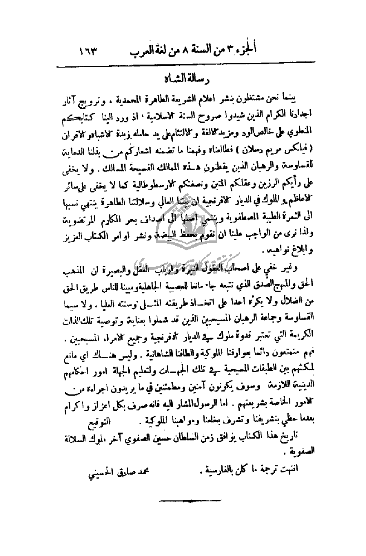 وغير خفي على أصحاب العقول النيرة وأرباب العقل والبصيرة أن المذهب الحق والمنهج الصدق الذي نتبعه جاء مانعاً للعصبية الجاهلية ومبيناً للناس طريق الحق من الظلال ولا يكره أحداً على اتخاذ طريقته المثلى وسنته العليا، ولا سيما القساوسة وجماعة الرهبان المسيحيين الذين قد شملوا بعناية وتوصية تلك الذات الكريمة التي تعتبر قدوة ملوك في الديار الإفرنجية وجميع الأمراء المسيحيين، فهم متمتعون دائماً بعوارفنا الملوكية والطائفية الشاهانية. وليس هناك أي مانع لمكثهم بين الطبقات المسيحية في تلك الجهات ولتعلم الجلة أمر أحكام الدينية اللازمة وسوف يكونون آمنين ومطمئنين في ما يريدون إجراءه من الأمور الخاصة بشريعتهم. أما الرسول المشار إليه فأنه صرف بكل إعزاز وإكرام بعدها حظي بتشرفنا وتشرف بخلعنا ومواهبنا الملوكية.