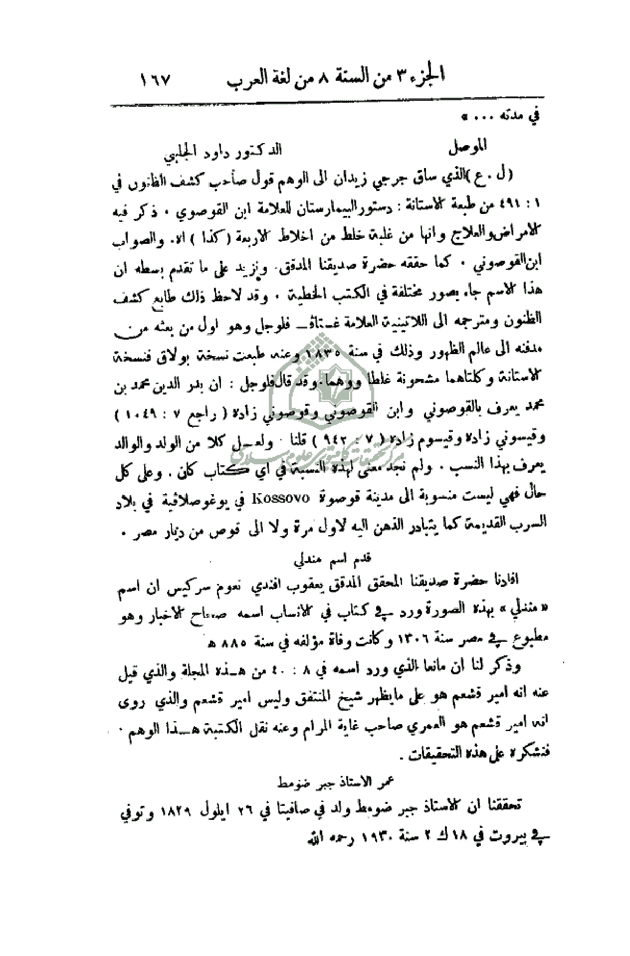 (ل. ع) الذي ساق جرجي زيدان إلى الوهم قول صاحب كشف الظنون في 1: 491 من طبعة الآستانة: دستور البيمارستان للعلامة أبن القوصوي. ذكر فيه الأمراض والعلاج وأنها من غلبة خلط من أخلاط الأربعة (كذا) أهـ. والصواب أبن القوصوني. كما حققه حضرة صديقنا المدقق. ونزيد على ما تقدم بسطه أن هذا الاسم جاء بصورة مختلفة في الكتب الخطية. وقد لاحظ ذلك طابع كشف الظنون ومترجمه إلى اللاتينية العلامة غستاف فلوجل وهو أول من بعثه من مدفنه إلى عالم الظهور وذلك في سنة 1835 وعنه طبعت نسخة بولاق فنسخه الآستانة وكلتاهما مشحونة غلطاً ووهماً. وقد قال فلوجل: أن بدر الدين محمد بن محمد يعرف بالقرصوني وأبن القوصوني وقوصوني زاده (راجع 7: 1049) وقيسوني زاده وقيسوم زاده (7: 942) قلنا: ولعل كلا من الولد والوالد يعرف بهذا النسب. ولم نجد معنى لهذه النسبة في أي كتاب كان. وعلى كل حال فهي ليست منسوبة إلى مدينة