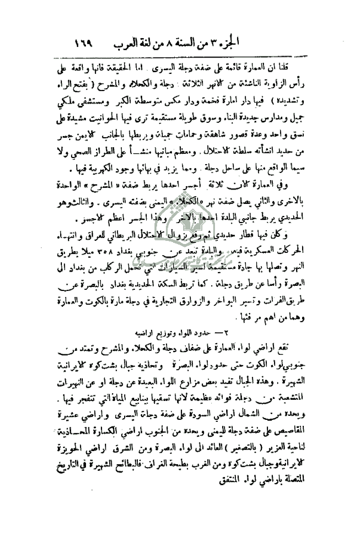 قلنا أن العمارة قائمة على ضفة دجلة اليسرى. أما الحقيقة فأنها واقعة على رأس الزاوية النائية من الأنهر الثلاثة: دجلة والكحلاء والمشرح (بفتح الراء وتشديده) فيها دار أمارة