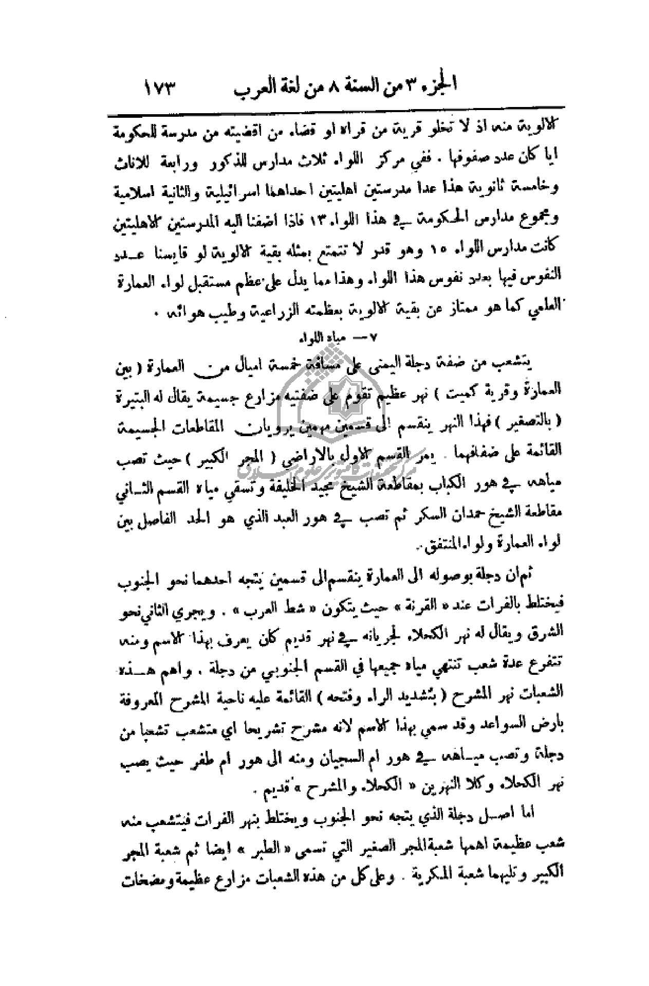 الألوية منه إذ لا تخلو قرية من قراره أو قضاء من اقضيته من مدرسة للحكومة أيا كان عدد صفوفها. ففي مركز اللواء ثلاث مدارس للذكر ورابعة للإناث وخامسة ثانوية هذا عدا مدرستين أهليتين إحداهما إسرائيلية والثانية إسلامية ومجموع مدارس الحكومة في هذا اللواء 13 فإذا أضفنا إليه المدرستين الأهليتين كانت مدارس اللواء 15 وهو قدر لا تتمتع بمثله بقية الألوية لو قايسنا عدد النفوس فيها بعدد نفوس اللواء وهذا يدل على عظم مستقبل لواء العمارة العلمي كما هو ممتاز عن بقية الألوية بعظمته الزراعية وطيب هوائه.