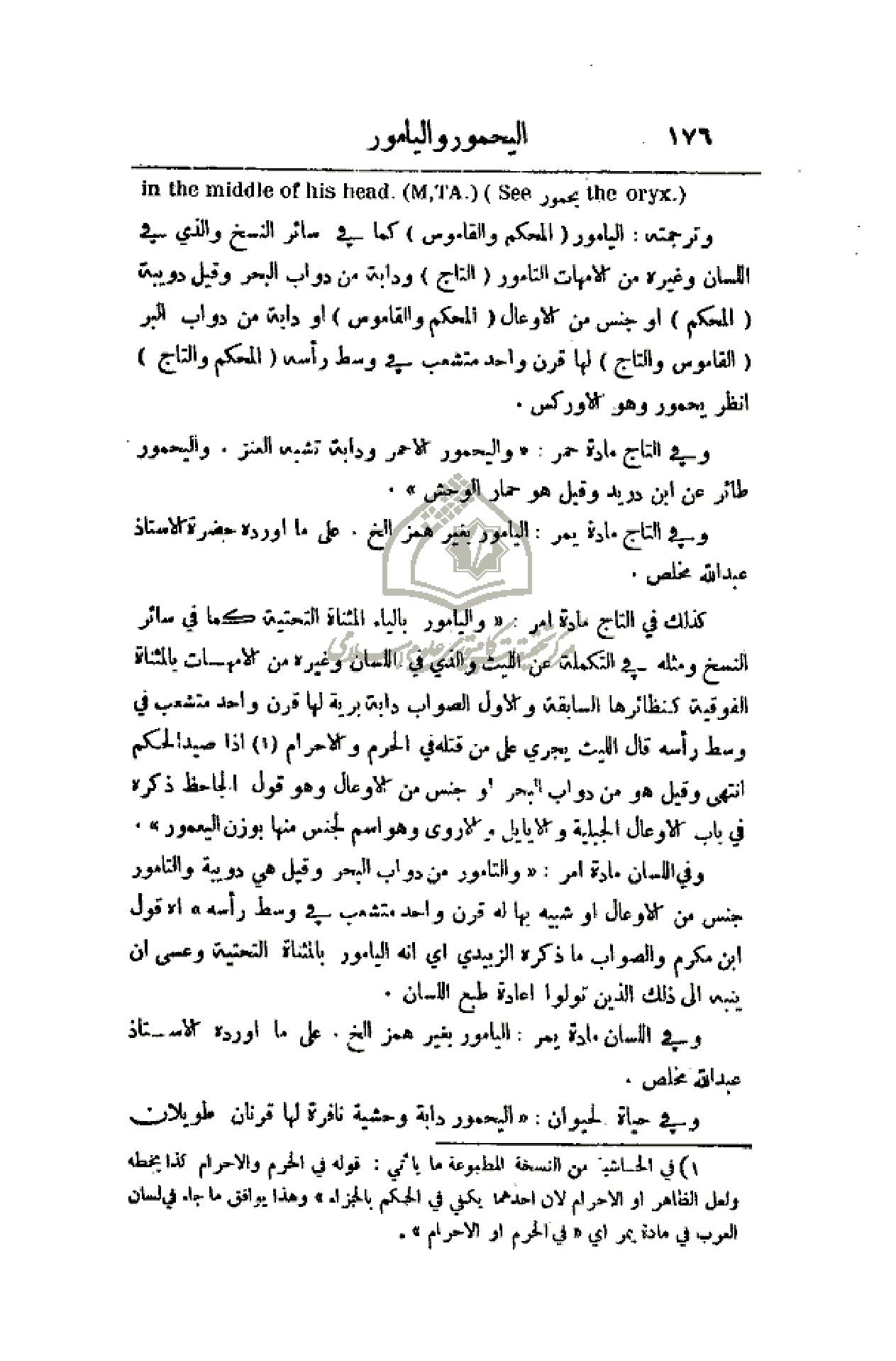 وفي اللسان مادة أمر: (والتامور من دواب البحر وقيل هي دويبة والتامور جنس من الأوعال أو شبيه بها له قرن واحد نتشعب في وسط رأسه) أهـ. قول أبن مكرم والصواب ما ذكره الزبيدي أي أنه اليامور بالمثناة التحتية وعسى أن ينبه إلى ذلك الذين تولوا إعادة طبع اللسان.