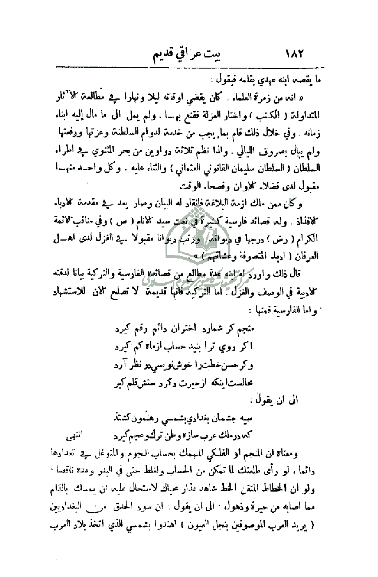 قال ذلك وأورد له أبنه عدة مطالع من قصائده الفارسية والتركية بياناً لدقته الأدبية في الوصف والغزل. أما التركية فأنها قديمة لا تصلح الآن للاستشهاد وأما الفارسية فمنها: