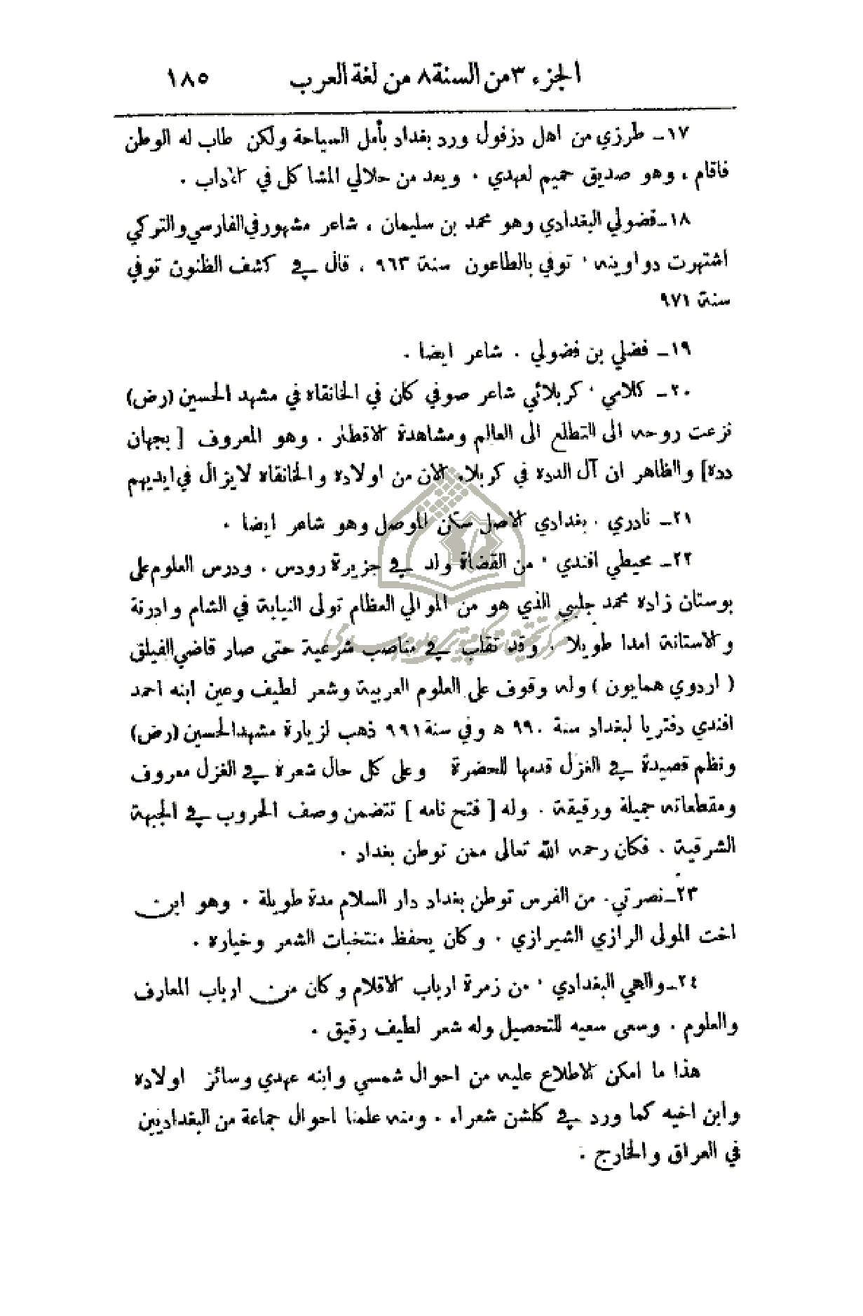 18 - فضول البغدادي وهو محمد بن سليمان. شاعر مشهور في الفارسي والتركي اشتهرت دواوينه. توفي بالطاعون سنة 963. قال في كشف الظنون توفي سنة 971.