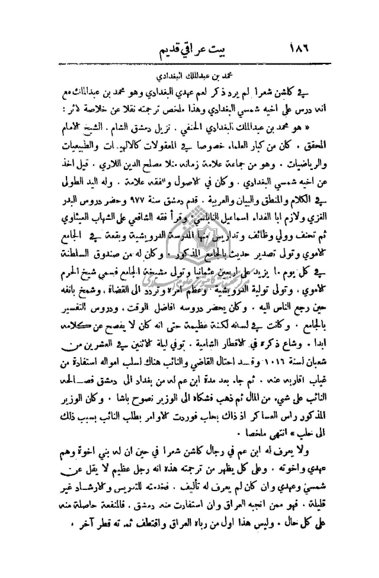 في كلشن شعراء لم يرد ذكر لعم عهدي البغدادي وهو محمد بن عبد الملك مع أنه درس على أخيه شمسي البغدادي وهذا ملخص ترجمته نقلاً عن خلاصة الأثر: (هو محمد بن عبد الملك البغدادي الحنفي، نزيل دمشق الشام، الشيخ الإمام المحقق. كان من كبار العلماء خصوصاً في المعقولات كالإلهيات والطبيعيات والرياضيات. وهو من جماعة علامة زمانه منلا مصلح الدين اللاري. قيل أخذ عن أخيه شمسي البغدادي. وكان في الأصول والفقه علامة. وله اليد الطولى في الكلام والمنطق والبيان والعربية. قدم دمشق سنة 977 وحضر دروس البدر الغزي ولازم أبا الفداء إسماعيل النابلسي، وقرأ فقه الشافعي على الشهاب العيثاوي ثم تحنف وولي وظائف وتدريس منها المدرسة الدرويشية وبقعة في الجامع الأموي وتولى تصدير حديث بالجامع المذكور. وكان له من صندوق السلطنة في كل يوم ما يزيد على أربعين عثمانياً وتولى مشيخة الجامع فسمى شيخ الحرم الأموي، وتولى تولية الدرويشية وعظم أمره وتردد إلى القضاء. وشمخ بأنفه حين رجع الناس إليه. وكان يحضر دروسه أفاضل الوقت، ودروس التفسير بالجامع. وكانت في لسانه لكنة عظيمة حتى أنه كان لا يفصح عن كلامه أبداً. وشاع ذكره في الأقطار الشامية. توفي ليلة الاثنين في