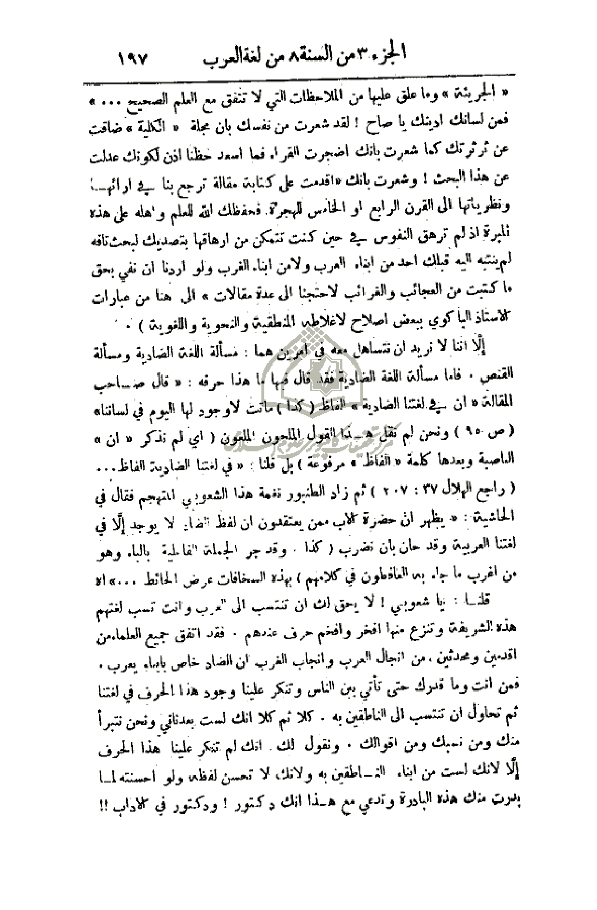 قلنا: يا شعوبي! لا يحق لك أن تنتسب إلى العرب وأنت تسب لغتهم هذه الشريفة وتنزع منها أفخر وأفخم حرف عندهم. فقد أتفق جميع العلماء من أقدمين ومحدثين، من إنجاب العرب وإنجاب الغرب أن الضاد خاص بإيماء يعرب. فمن أنت وما قدرك حتى تأتي بين الناس وتنكر علينا وجود هذا الحرف في لغتنا ثم تحاول أن تنتسب إلى الناطقين به. كلا ثم كلا أنك لست بعدناني ونحن نتبرأ منك ومن نسبك ومن أقوالك، ونقول لك: أنك لم تنكر علينا هذا الحرف إلا لأنك لست من أبناء الناطقين به ولأنك لا تحسن لفظه ولو أحسنته لما بدرت منك هذه البادرة وتدعي مع هذا أنك دكتور! ودكتور في الآداب!!.