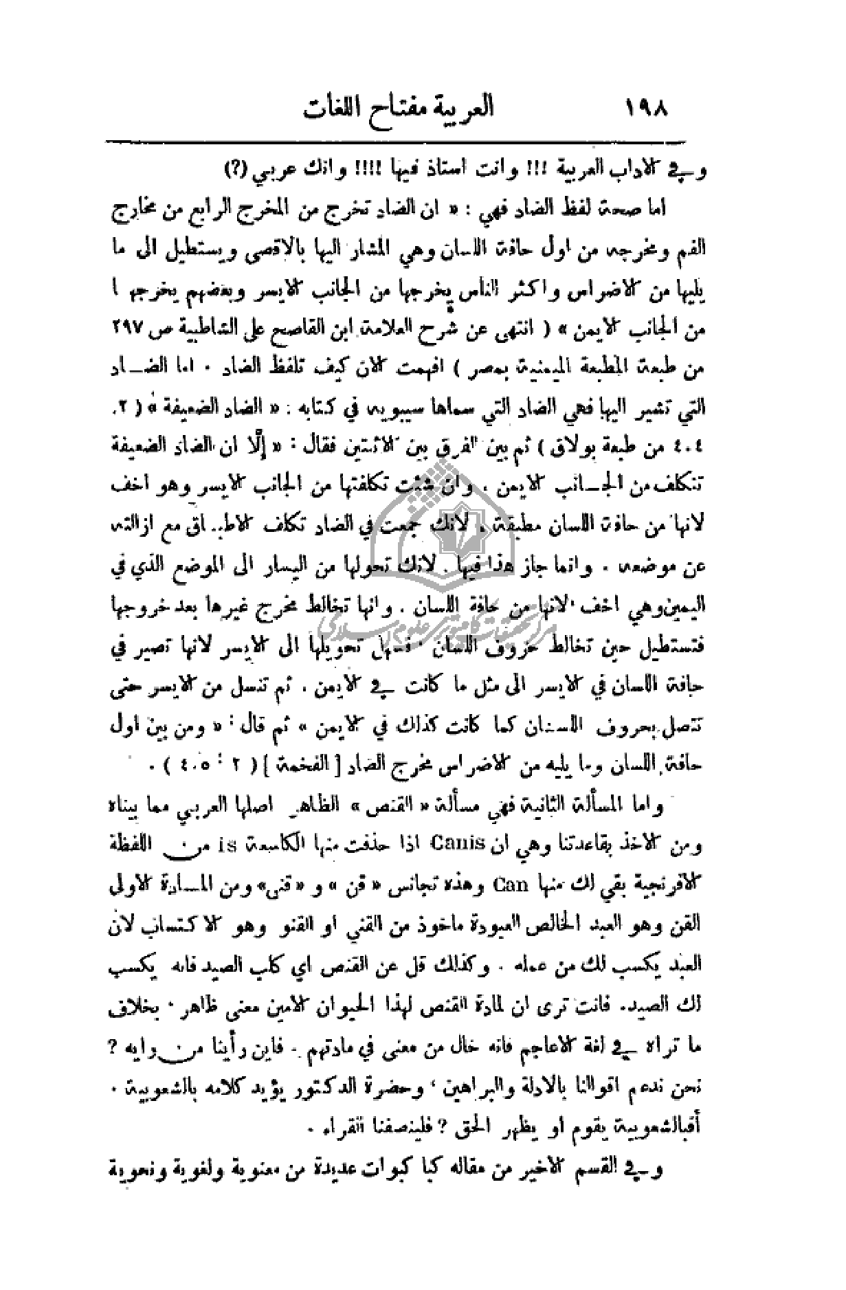 وأكثر الناس يخرجها من الجانب الأيسر وبعضهم يخرجها من الجانب الأيمن) (انتهى عن شرح العلامة أبن القاصح على الشاطبية ص 297 من طبعة المطبعة الميمنية بمصر) أفهمت الآن كيف تلفظ الضاد، أما الضاد التي تشير إليها فهي الضاد التي سماها سيبويه في كتابه: (الضاد الضعيفة) (2: 404 من طبعة بولاق) ثم الفرق بين الاثنتين فقال: (إلا أن الضاد الضعيفة تتكلف من الجانب الأيمن، وأن شئت تكلفتها من الجانب الأيسر وهو أخف لأنها من حافة اللسان مطبقة، لأنك جمعت في الضاد تكلف الأطباق مع إزالته عن موضعه. وإنما جاز هذا فيها. لأنك تحولها من اليسار إلى الموضع الذي في اليمين وهي أخف، لأنها من حافة اللسان، وأنها تخالط مخرج غيرها بعد خروجها فتستطيل حين تخالط حروف اللسان، فسهل تحويلها إلى الأيسر لأنها تصير في حافة اللسان في الأيسر إلى مثل ما كنت في الأيمن، ثم تنسل من الأيسر حتى تتصل بحروف اللسان كما كانت كذلك في الأيمن) ثم قال: (ومن بين أول حافة اللسان وما يليه من الأضراس مخرج الصاد (الفخمة) (2: 405).