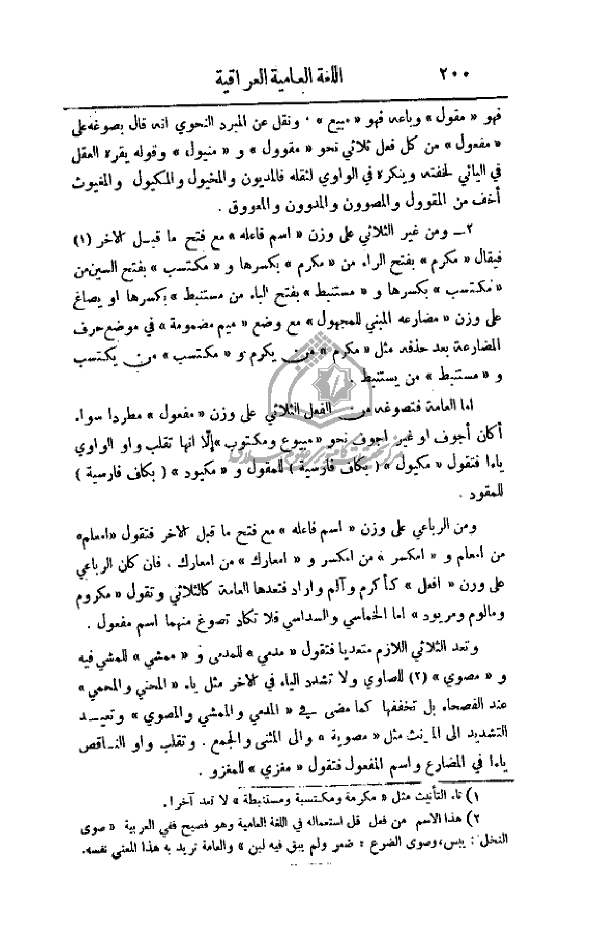 أما العامة فتصوغه من الفعل الثلاثي على وزن (مفعول) مطرداً سواء أكان أجوف أو غير أجوف نحو (مبيوع ومكتوب) إلا أنها تقلب واو الواوي ياءاً فتقول (مكيول) (بكاف فارسية) للمقول و (مكيود) (بكاف فارسية) للمقود.