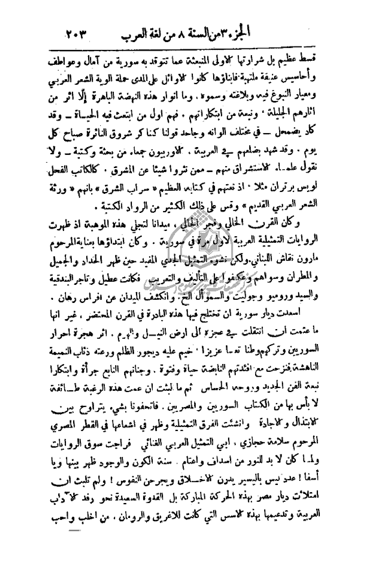 وكان القرن الخالي وفجر الحالي، ميداناً لتجلي هذه الموهبة إذ ظهرت الروايات التمثيلية العربية لأول مرة في سورية. وكان ابتداؤها بعناية المرحوم مارون نقاش اللبناني. ولكن نشوء التمثيل الجدي المفيد حين ظهر الحداد والجميل والمطران وسواهم وعكفوا على التأليف فكانت عطيل وتاجر البندقية والسيد وروميو وجوليت والسموأل الخ. وانكشف الميدان عن أفراس رهان.