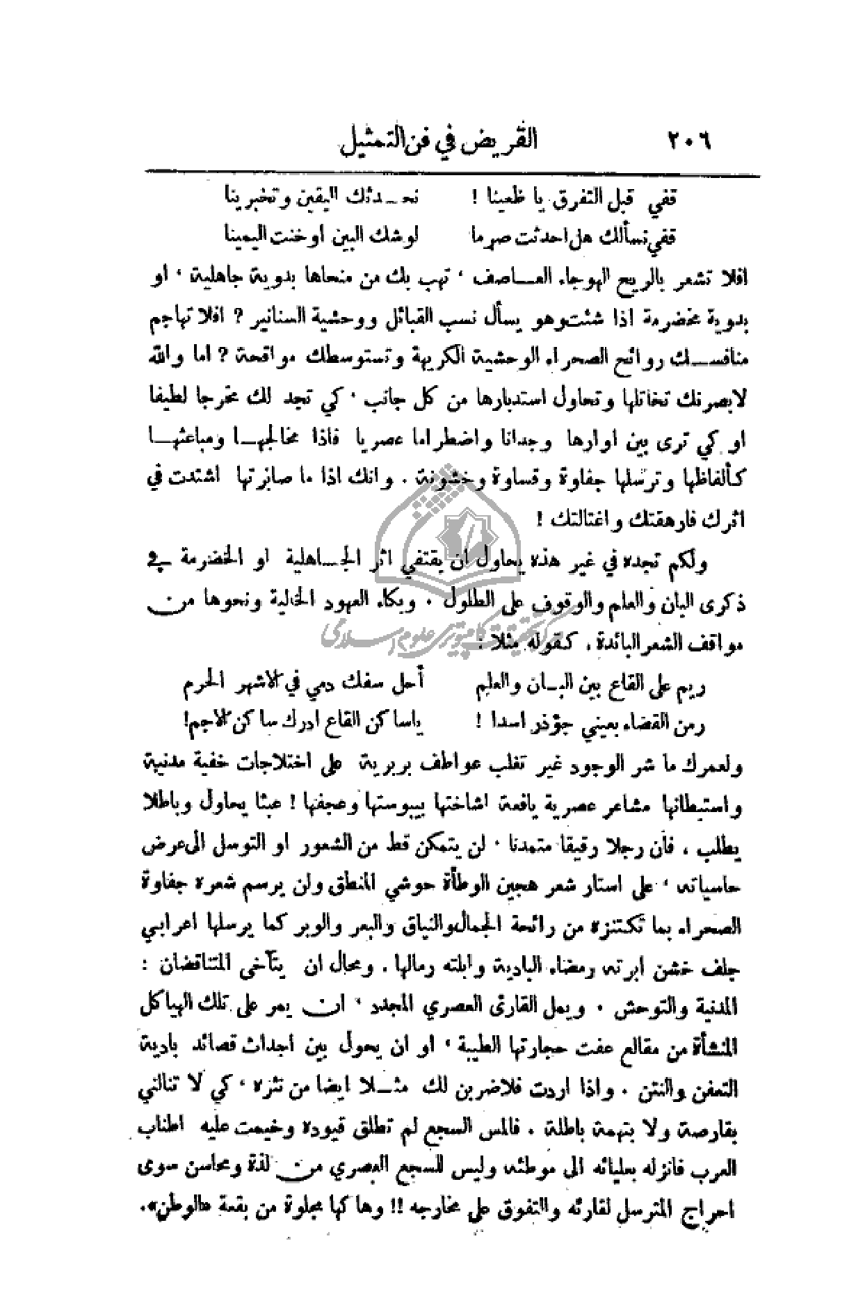 أفلا تشعر بالريح الهوجاء العاصف، تهب بك من منحاها بدوية جاهلية، أو بدوية مخضرمة إذا شئت وهو يسأل نسب القبائل ووحشية السنانير؟ أفلا تهاجم منافسك روائح الصحراء الوحشية الكريهة وتستوسطك مواقحة؟ أما والله لأبصرنك تخاتلها وتحاول استدبارها من كل جانب، كي تجد لك مخرجاً لطيفاً أو كي ترى بين أوارها وجدانا واضطراما عصرياً فإذا مخالجها ومباعثها كألفاظها وترسلها جفاوة وقساوة وخشونة. وأنك إذا ما صابرتها