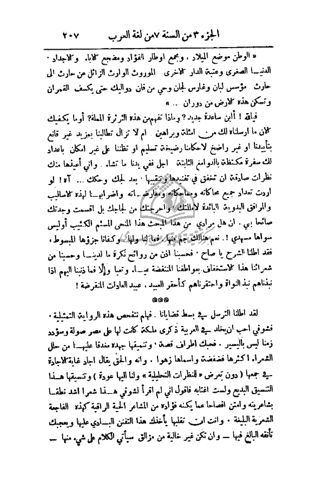 فيالله! أابن ساعده جديد؟ وماذا من هذه الثرثرة المملة؟ أو ما يكفيك الآن ما أرسلناه لك من أمثلة وبراهين أم لا تزال تطالبنا بمزيد غير قانع بتأييدنا أو غير راضخ لإحكامنا رضيخة تسليم أو تظننا على غير إمكان بإعداد لك سفرة مكتظة الدوافع الثابتة أجل ففي يدنا ما تشاء وأني أعيذها منك نظرات صادقة أن تخفق في تفنيدها وتنقيبها، بعد لجك وحك. . . آه!. لو أردت تعداد جميع محاكاته ومماحكاته ومعارضاته وإضرابها لهذه الأساليب والمرافق البدوية البائدة لا مللتك، وأحرجتك من لجاجك بل أقسمت وجدتك صائحا بي، أن