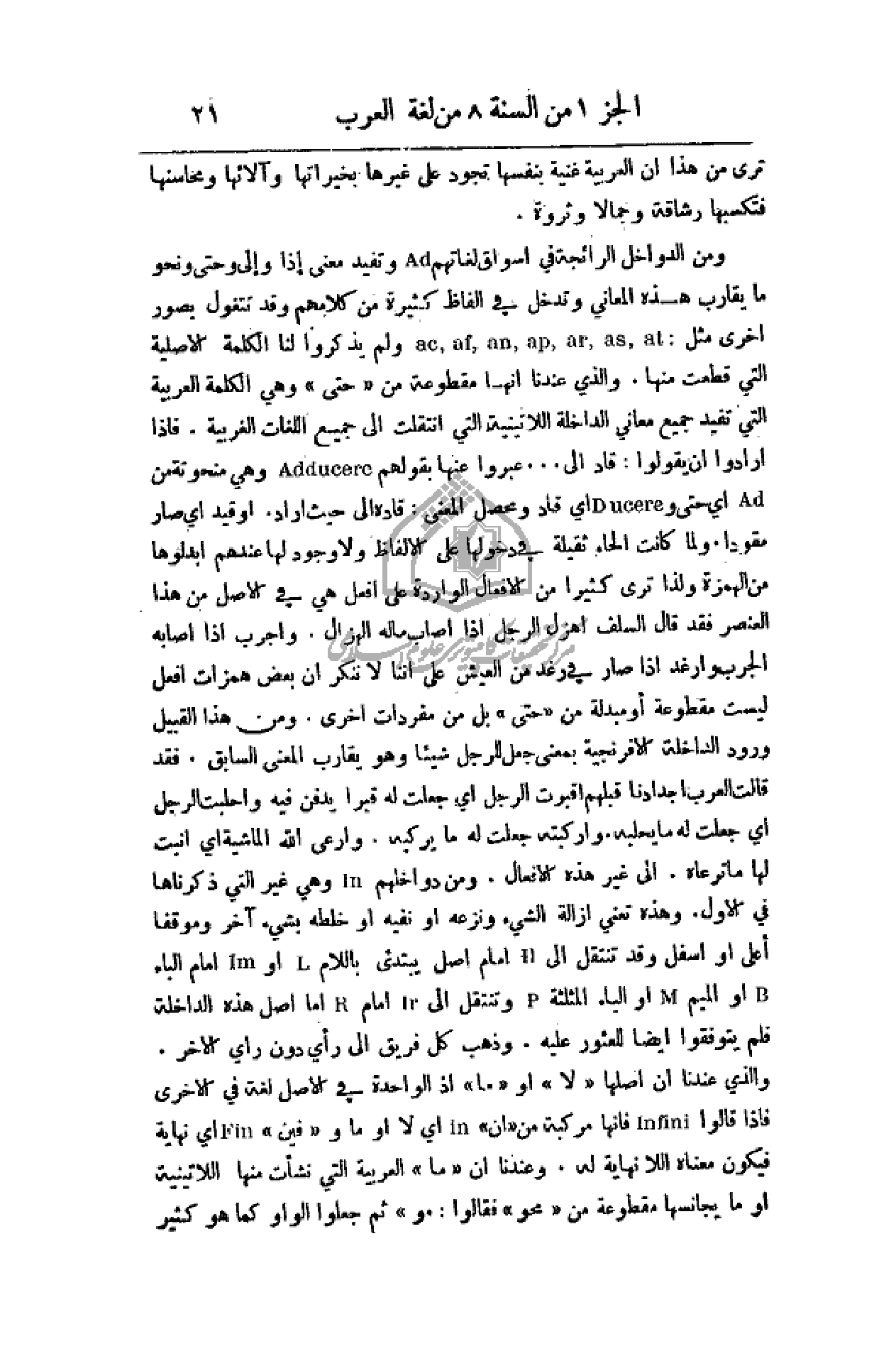 ومن الدواخل الرائجة في أسواق لغاتهم وتفيد معنى إذا وإلى وحتى ونحو ما يقارب هذه المعاني وتدخل في ألفاظ كثيرة من كلامهم وقد تتغول بصور أخرى مثل: ولم يذكروا لنا الكلمة الأصلية التي قطعت منها. والذي عندنا أنها مقطوعة من (حتى) وهي الكلمة العربية التي تفيد جميع معاني الداخلة اللاتينية التي انتقلت إلى جميع اللغات الغربية. فإذا أرادوا أن يقولوا: قاد إلى. . . عبروا عنها بقولهم وهي منحوتة من أي حتى أي قاد ومحصل المعنى: قاده إلى حيث أراد، أو قيد أي صار مقوداً. ولما كانت الحاء ثقيلة في دخولها على الألفاظ ولا وجود لها عندهم أبدلوها من الهمزة ولذا ترى كثيراً من الأفعال الواردة على أفعل هي في الأصل من هذا العنصر فقد قال السلف أهزل الرجل إذا أصاب ماله الهزال، وأجرب إذا أصابه الجرب وأرغد إذا صار في رغد من العيش. على أننا لا ننكر أن بعض همزات أفعل ليست مقطوعة أو مبدلة من (حتى) بل من مفردات أخرى. ومن هذا القبيل ورود الداخلة الإفرنجية بمعنى جعل للرجل شيئاً وهو يقارب المعنى السابق. فقد قالت العرب أجدادنا قبلهم أقبرت الرجل أي جعلت له قبراً يدفن فيه وأحلبت الرجل أي جعلت له ما يحلبه، وأركبته جعلت له ما يركبه، وأرعى الله الماشية