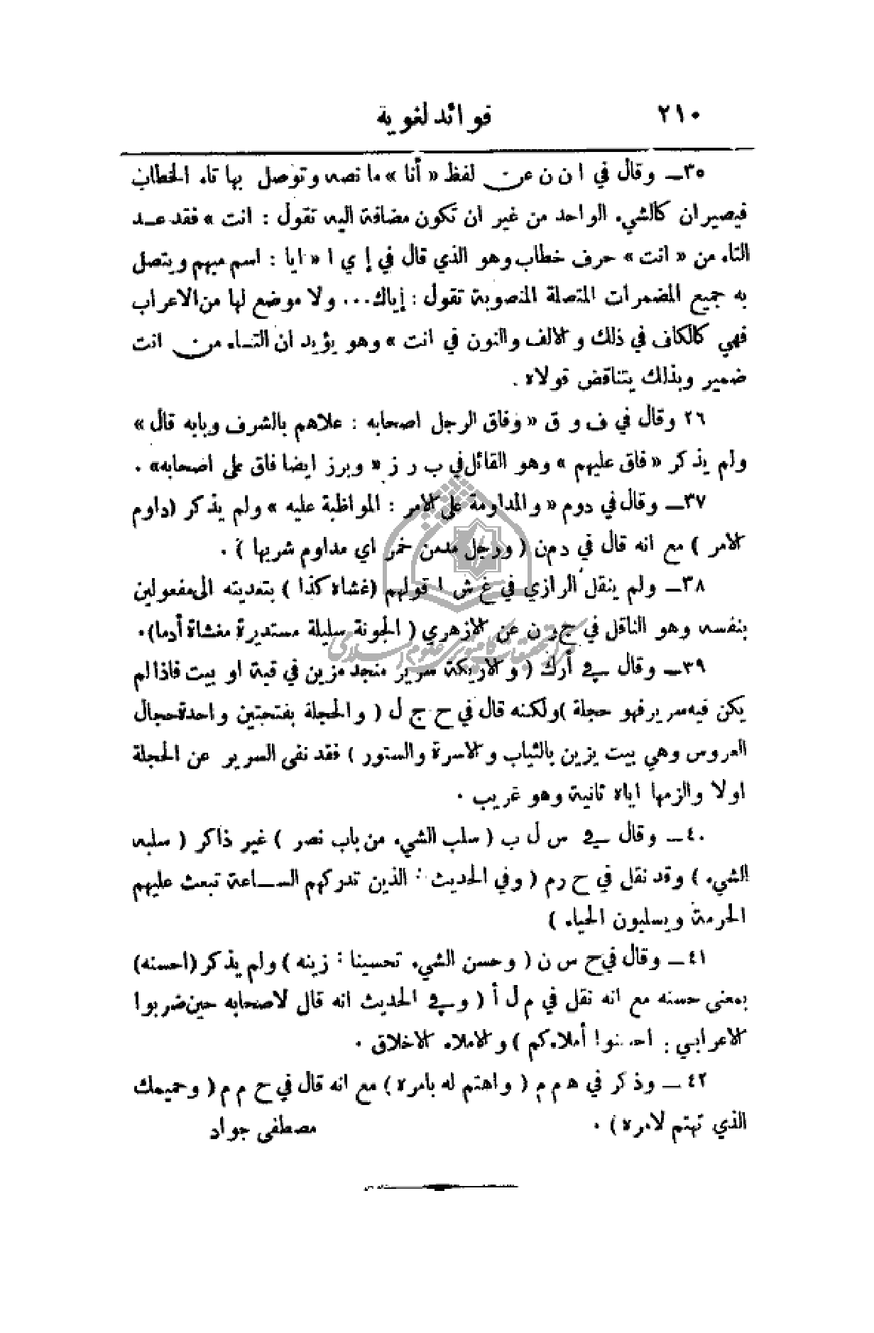 37 - وقال في دوم (والمداومة على الأمر: المواظبة عليه) ولم يذكر (دوام الأمر) مع أنه قال في د م ن (ورجل مدمن خمر أي مداوم شربها).