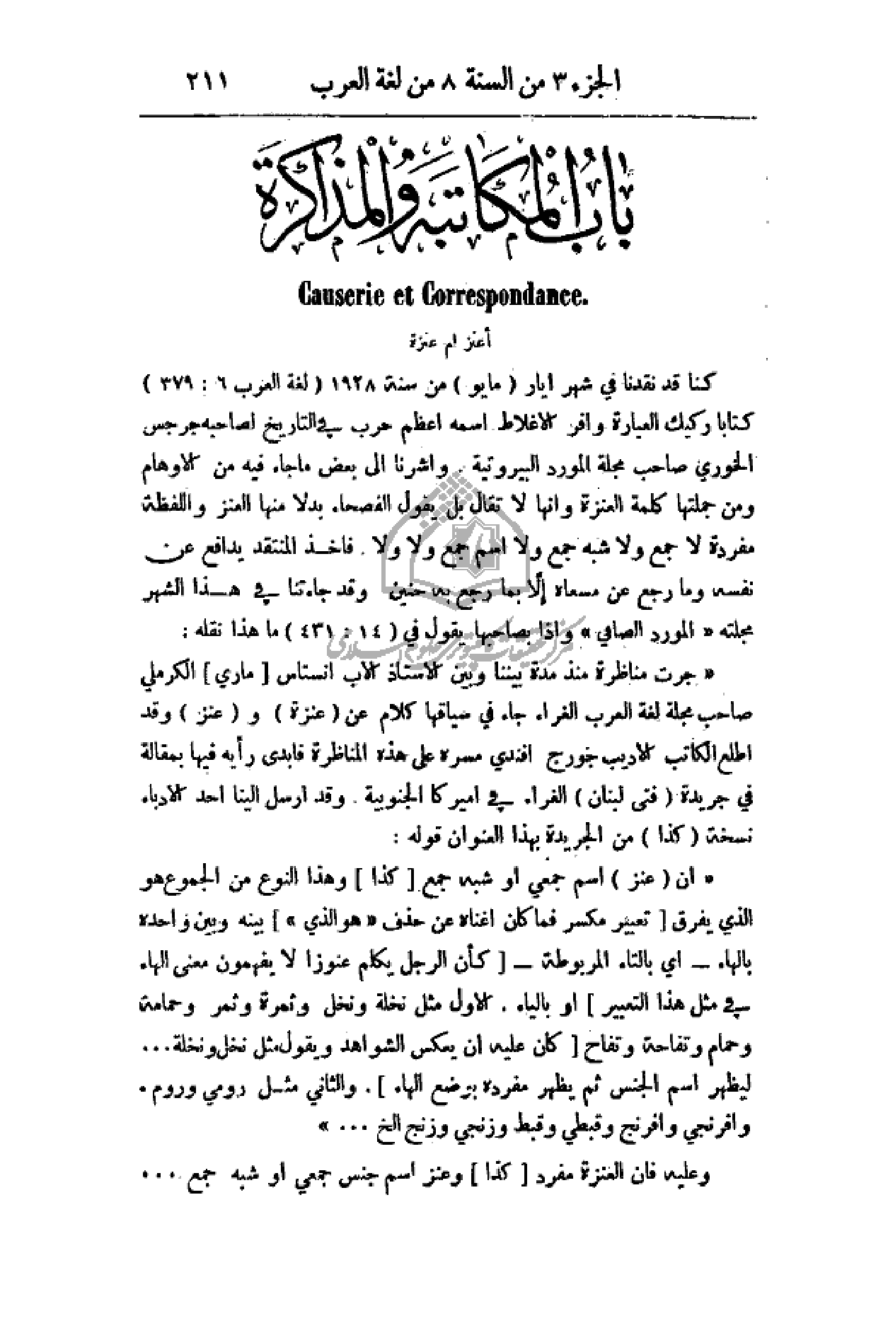 كنا قد نقدنا في شهر أيار (مايو) من سنة 1928 (لغة العرب 6: 379) كتاباً ركيك العبارة وافر الأغلاط أعظم أسمه أعظم حرب في التاريخ لصاحبه جرجس الخوري صاحب مجلة المورد البيروتية. وأشرنا إلى بعض ما جاء فيه من الأوهام ومن جملتها كلمة العنزة وأنها لا تقال بل يقول الفصحاء بدلاً منها العنز والفظة مفردة لا جمع ولا شبه جمع ولا اسم جمع ولا ولا. فأخذ المنتقد يدافع عن نفسه وما رجع عن مسعاه إلا بما رجع به حنين. وقد جاءتنا في هذا الشهر مجلته (المورد الصافي) وإذا بصاحبها يقول في (14: 431) ما هذا نقله: