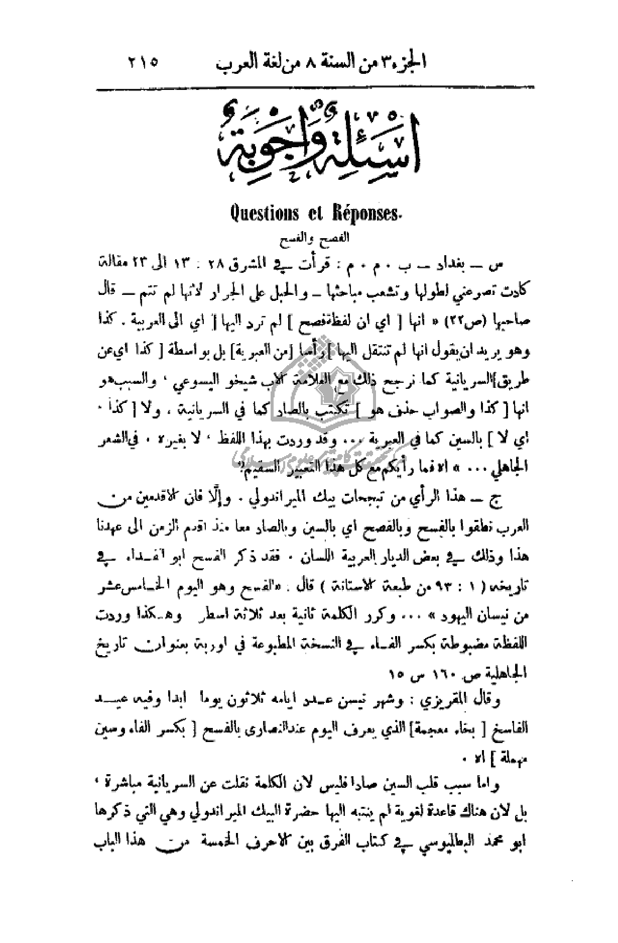 ج - هذا الرأي من تبجحات بيك المير الميراندولي. وإلا فأن الأقدمين من العرب نطقوا بالفسح وبالفصح أي بالسين وبالصاد معاً منذ أقدم الزمن إلى عهدنا هذا وذلك في بعض الديار العربية اللسان. فقد ذكر الفسح أبو الفداء في تاريخه (1: 93 من طبعة الأستانة) قال: (الفسح وهو اليوم الخامس عشر من نيسان اليهود). . . وكرر الكلمة ثانية بعد ثلاثة أسطر وهكذا وردت اللفظة مضبوطة بكسر الفاء في النسخة المطبوعة في أوربة بعنوان تاريخ الجاهلية ص 160 س 15.