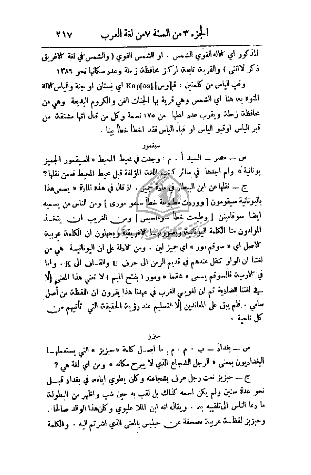 ج - نقلها عن أبن البيطار في مادة جميز، إذ قال في هذه المادة (يسمى هذا باليونانية سيقومون (ووردت مطبوعة خطأ سنفو مورى) ومن الناس من يسميه أيضاً سوقامينن (وطبعت خطأ سوماسيس) ومن الغريب أن يتخذ المولدون منا الكلمة اليونانية وبصورتها الإغريقية ويجهلون أن الكلمة عربية الأصل أي (سوقم مور) أي جميز لين. ومن الأدلة على أن اليونانية هي من لغتنا أو الواو تنقل عندهم في قديم الزمن إلى حرف والقاف إلى وأما في الارمية فالسوقم يسمى (شقما) ومور (بفتح الميم) لا تعني هذا المعنى إلا في لغتنا الضادية ثم أن لغويي الغرب في عهدنا هذا يقرون أن اللفظة من أصل سامي، فلم يبق على المعاندين إلا التسليم عند رؤية الحقيقة التي تأتيهم من كل ناحية.