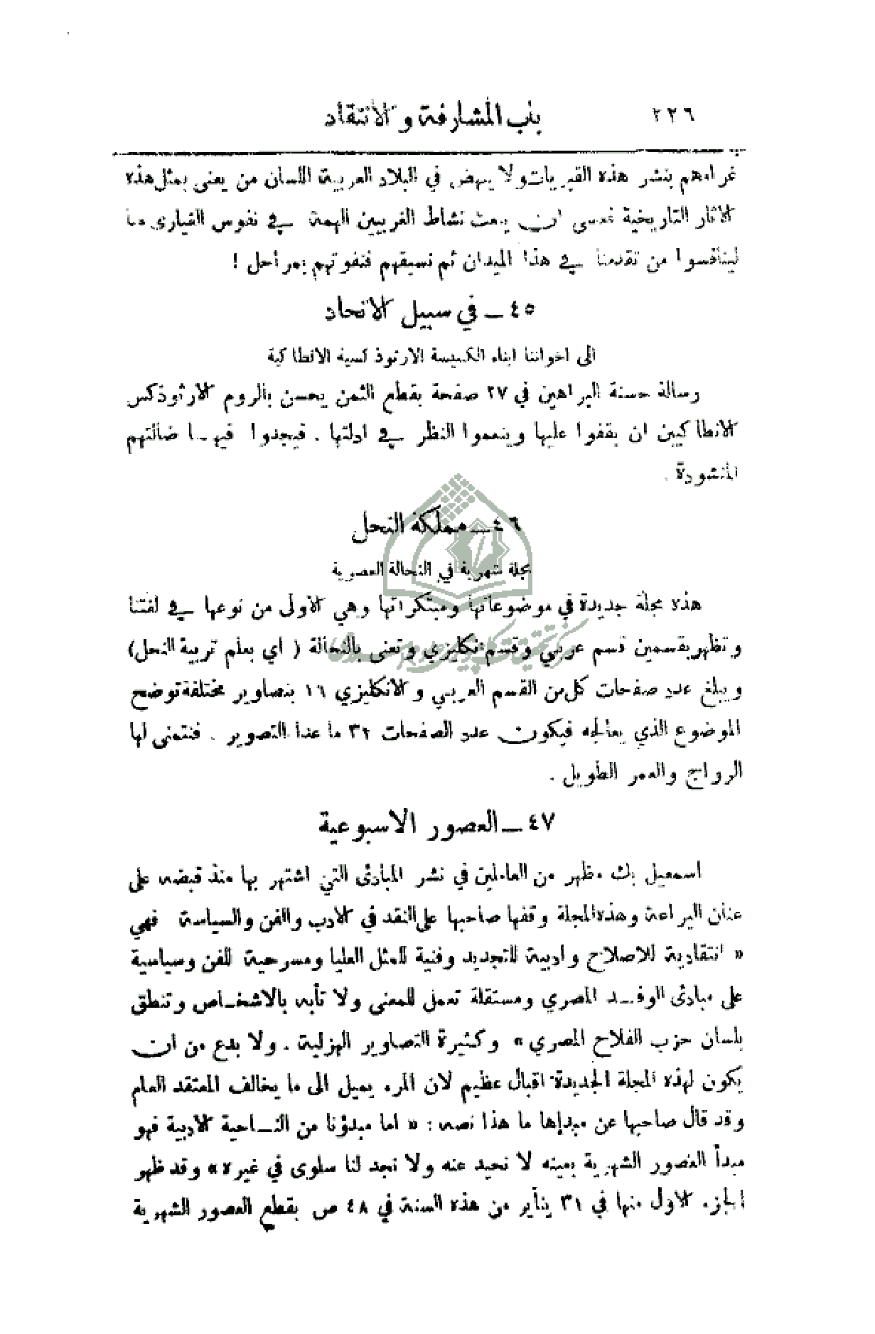إسماعيل بك مظهر من العاملين في نشر المبادئ التي أشتهر بها منذ قبضة على عنان اليراعة وهذه المجلة وقفها صاحبها على النقد في الأدب والفن والسياسة فهي (انتقادية للإصلاح وأدبية للتجديد وفنية للمثل العليا ومسرحية للفن وسياسية على مبادئ حزب الفلاح المصري) وكثيرة التصاوير الهزلية. ولا بدع من أن يكون لهذه المجلة الجديدة إقبال عظيم لأن المرء يميل إلى ما يخالف المعتقد العام وقد قال صاحبها عن مبدأها ما هذا نصه: (أما مبدؤنا من الناحية الأدبية فهو مبدأ العصور الشهرية بعينه لا نحيد عنه ولا نجد لنا سلوى في غيره) وقد ظهر الجزء الأول منها في 31 يناير من هذه السنة في 48 ص بقطع العصور الشهرية
