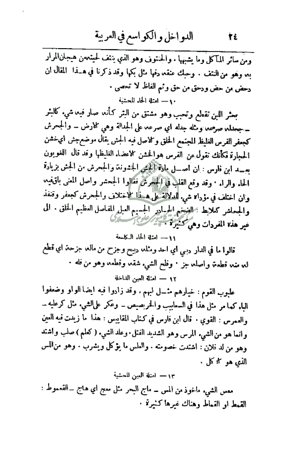 بحثر اللبن تقطع وحبب وهو مشتق من البثر كأنه صار فيه شيء كالبثر - جحدله صرعه ومثله جدله أي صرعه على الجدالة وهي الأرض - والجحرش كجعغر الفرس الغليظ المجتمع الخلق والأصل فيه الجش يقال موضع جش أي خشن الحجارة فكأنك تقول عن الفرس هو الخشن الأخطاء الغليظها وقد قال اللغويون بعد أبن فارس: أن أصل مادة الجش الخشونة والجحرش من الجش بزيادة الحاء والراء، وقد وقع القلب في الجحرش فقالوا الجحشر وأصل المعنى باق فيه وأن أختلف في مؤداه شيء للدلالة على هذا الاختلاف والجحرش كجعفر وقنفذ والجحاشر كعلابط: الضخم الحادر الجسيم العبل المفاصل العظيم الخلق، إلى غير هذه المفردات وهي كثيرة.