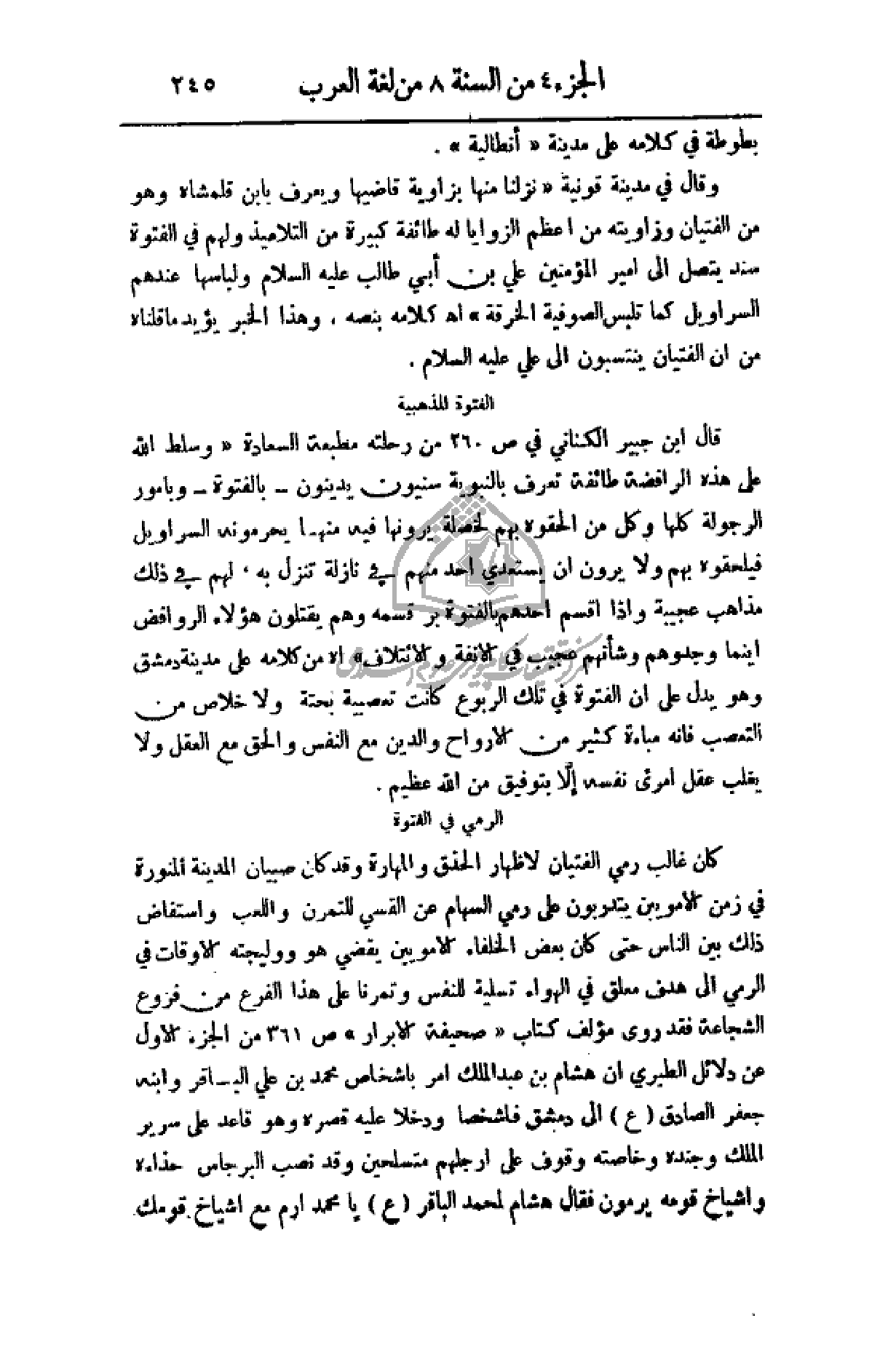 قال ابن جبير الكناني في ص 260 من رحلته مطبعة السعادة (وسلط الله على هذه الرافضة طائفة تعرف بالنبوية سنيون يدينون - بالفتوة - وبأمور الرجولة كلها وكل من ألحقوه بهم لخصلة يرونها فيه منهما يحرمونه السراويل فيلحقوه بهم ولا يرون أن يستعدي أحد منهم في نازلة تنزل به، لهم في ذلك مذاهب عجيبة وإذا اقسم أحدهم بالفتوة بر قسمه وهم يقتلون هؤلاء الروافض أينما وجدوهم وشأنهم عجيب في الألفة وائتلاف) اهـ من كلامه على مدينة دمشق وهو يدل على أن الفتوة في تلك الربوع كانت تعصبية بحتة ولا خلاص من التعصب فانه مباءة كثير من الأرواح والدين مع النفس والحق مع العقل ولا يغلب عقل امرئ نفسه إلا بتوفيق من الله عظيم.