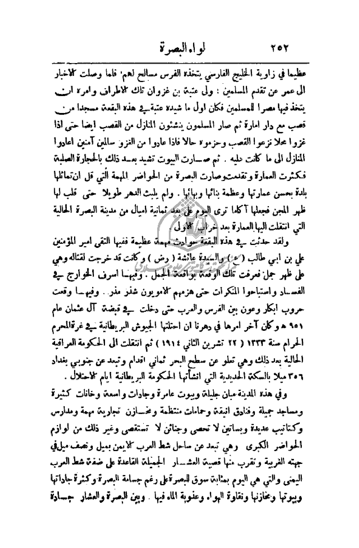 ولقد حدثت في هذه البقعة حوادث مهمة عظيمة ففيها التقى أمير المؤمنين علي بن أبي طالب (ع) والسيدة عائشة (رض) وكانت قد خرجت لقتاله وهي على ظهر جمل فعرفت تلك الواقعة بواقعة الجمل. وفيها أسرف الخوارج في الفساد واستباحوا المنكرات حتى هزمهم الأمويين شذر مذر. وفيها وقعت حروب أبكار وعون بين الفرس والعرب حتى دخلت في قبضة آل عثمان عام 951هـ وكان آخر أمرها في دهرنا أن احتلتها الجيوش البريطانية في غرة المحرم الحرام سنة 1333 (22 تشرين الثاني 1914) ثم انتقلت إلى الحكومة العراقية الحالية بعد ذلك وهي تعلو عن سطح البحر ثماني أقدام وتبعد عن جتوبي بغداد 356 ميلا بالسكة الحديد التي أنشأتها الحكومة البريطانية أيام الاحتلال.