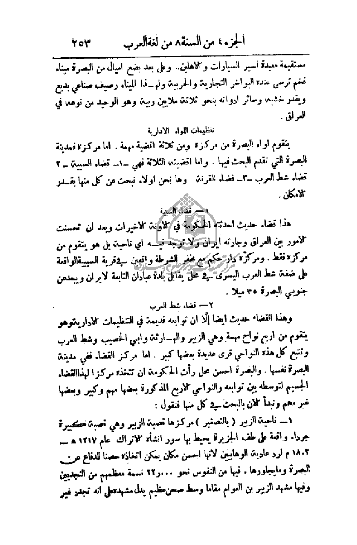مستقيمة معبدة لسير السيارات والاهلين. وعلى بعد بضع أميال من البصرة ميناء فخم ترسى عنده البواخر التجارية والحربية ولهذا الميناء رصيف صناعي بديع ويقدر خشبه وسائر أدواته بنحو ثلاثة ملايين ربية وهو الوحيد من نوعه في العراق.