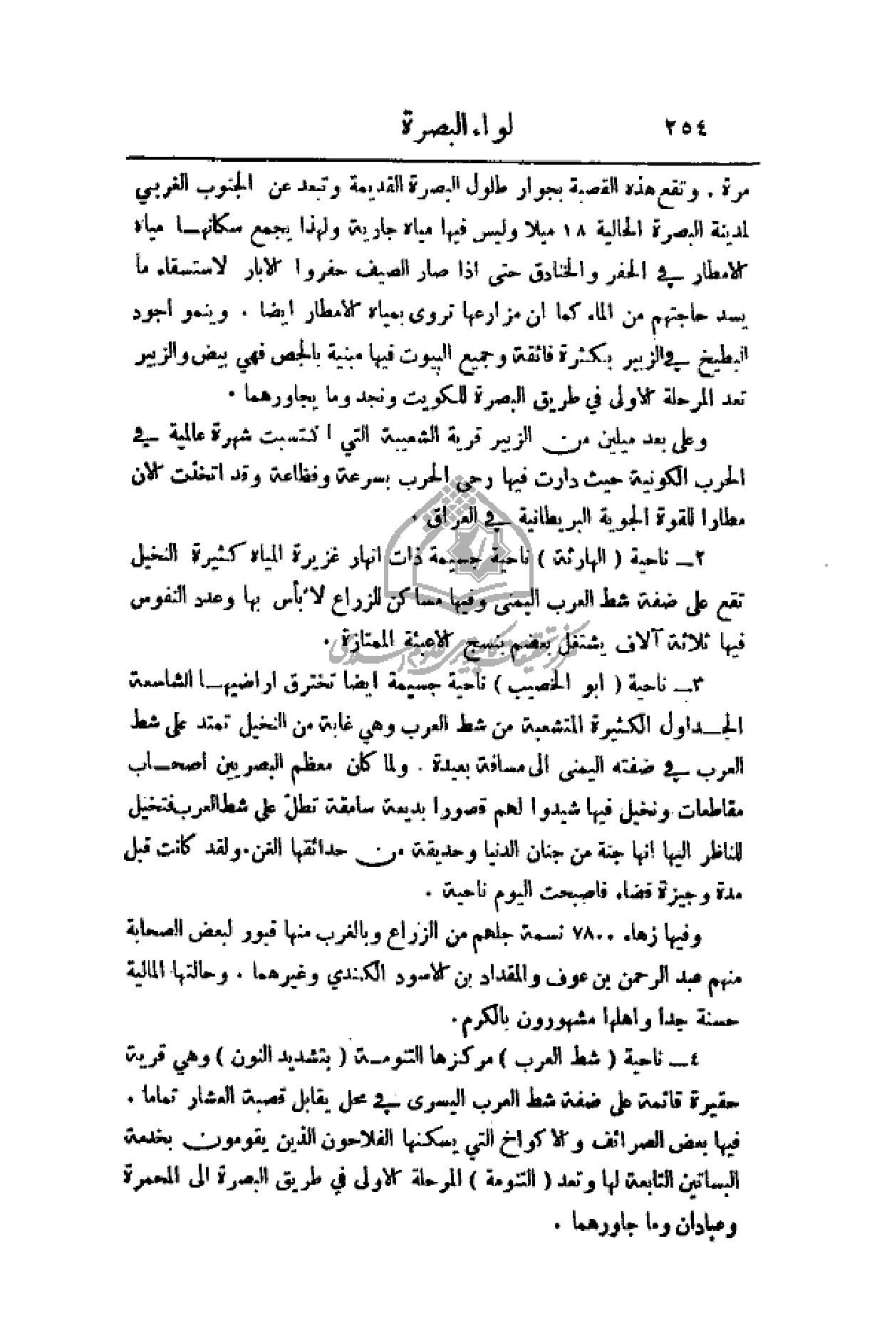 2 - ناحية (الهارثة) ناحية جسيمة ذات انهار غزيرة المياه كثيرة النخيل تقع على ضفة شط العرب اليمنى وفيها مساكن للزراع لا بأس بها وعدد النفوس فيها ثلاثة آلاف يشتغل بعضهم بنسج الأعبئة الممتازة.