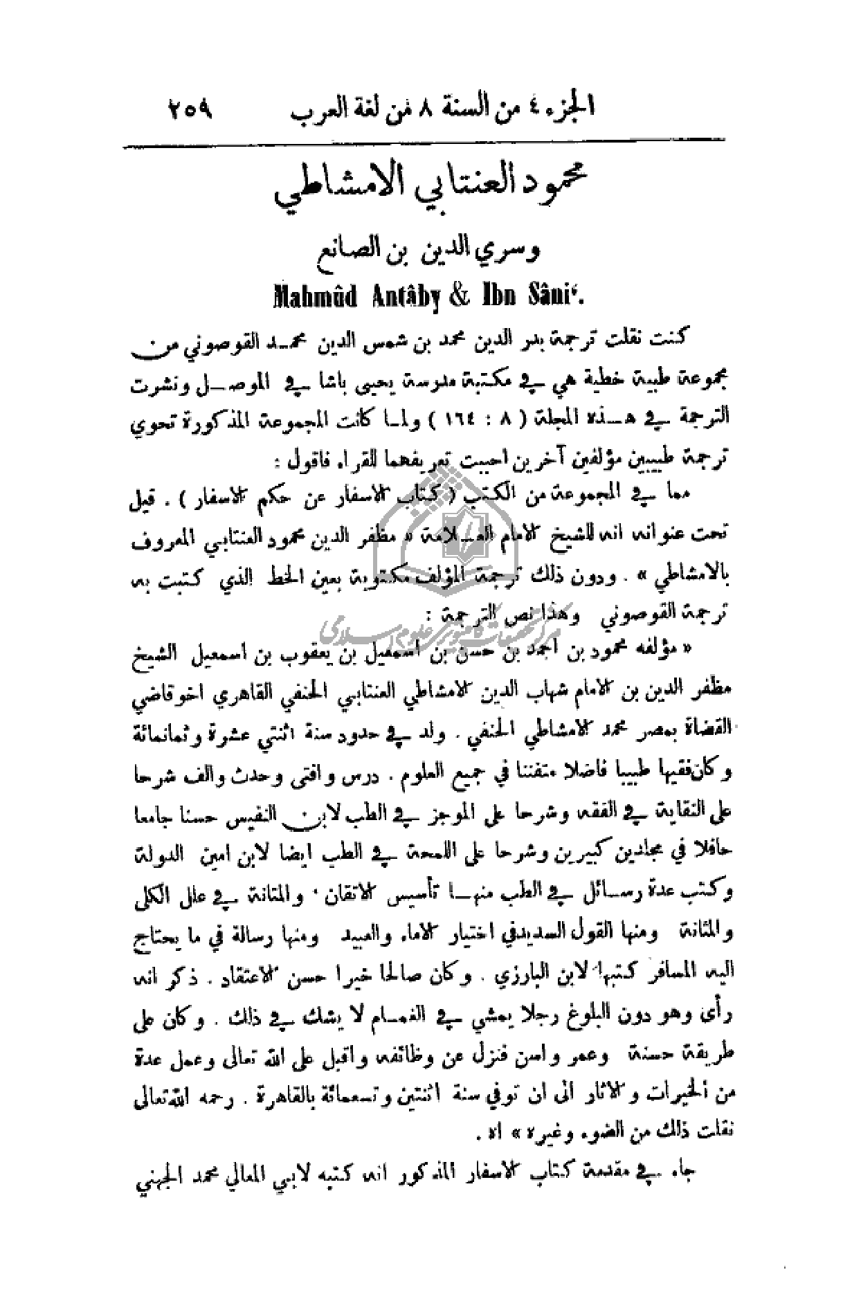 مما في المجموعة من الكتب (كتاب الأسفار عن حكم الأسفار). قيل تحت عنوانه انه للشيخ الإمام العلامة (مظفر الدين محمود العنتابي المعروف بالامشاطي)، ودون ذلك ترجمة المؤلف مكتوبة بعين الخط الذي كتبت به ترجمة القوصوني وهذا نص الترجمة: