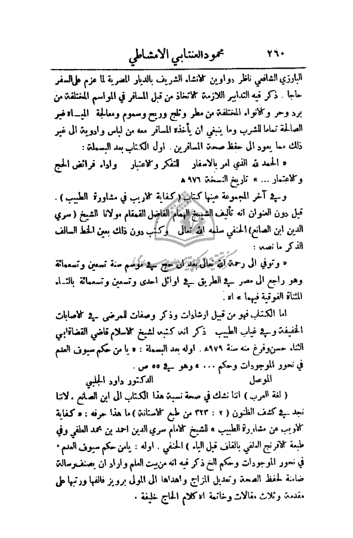 (لغة العرب) إننا نشك في صحة نسبة هذا الكتاب إلى ابن الصانع، لأننا نجد في كشف الظنون (323: 2 من طبع الآستانة) ما هذا حرفه: (كفاية الأريب عن مشاورة الطبيب) للشيخ الإمام سري الدين احمد بن محمد العلفي وفي طبعة الإفرنج العلقي بالقاف قبل الياء) الحنفي. أوله: يا من حكم سيوف العدم، في نحور الموجودات وحكم الخ ذكر فيه انه من بيت العلم وأراد أن يصنف رسالة ضامنة لحفظ الصحة وتعديل المزاج وأهداها إلى المولى برويز فألفها ورتبها على مقدمة وثلاث مقالات وخاتمة اهـ كلام الحاج خليفة.