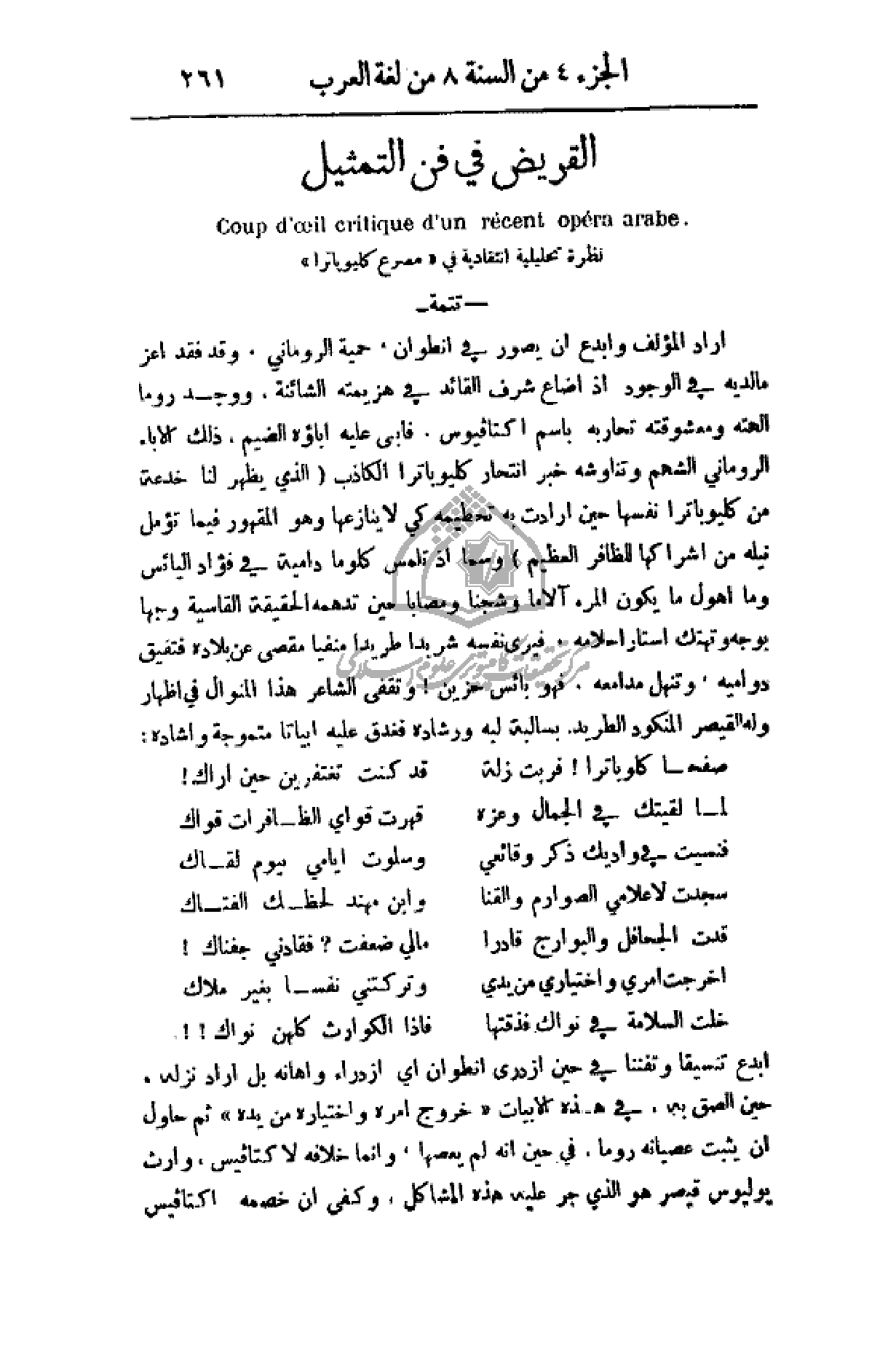 أرد المؤلف وأبدع أن يصور في انطوان، حمية الروماني، وقد فقد اعز ما لديه في الوجود إذ أضاع شرف القائد في هزيمته الشائنة، ووجد روما ألهته ومعشوقته تحاربه باسم اكتافيوس، فابى عليه آباؤه الضيم، ذلك الإباء الروماني الشهم وتناوشه خبر انتحار كليوباترا الكاذب (الذي يظهر لنا خدعة من كليوباترا نفسها حين أرادت به تحطيمه كي لا ينازعها وهو المقهور فيما تؤمل نيله من إشراكها للظافر العظيم) وسما إذ تلمس كلوما دامية في فؤاد اليائس وما أهول ما يكون المرء آلاما وشجنا ومصابا حين تدهمه الحقيقة القاسية وجها بوجه وتهتك أستار أحلامه. فيرى نفسه شريدا طريدا منفيا مقصى عن بلاده فتفيق دواميه، وتنهل مدامعه، فهو بائس حزين! وتقفى الشاعر هذا المنوال في إظهار وله القيصر المنكود الطريد، بسالبة لبه ورشاده فغدق عليه أبياتا متموجة وأشاده: