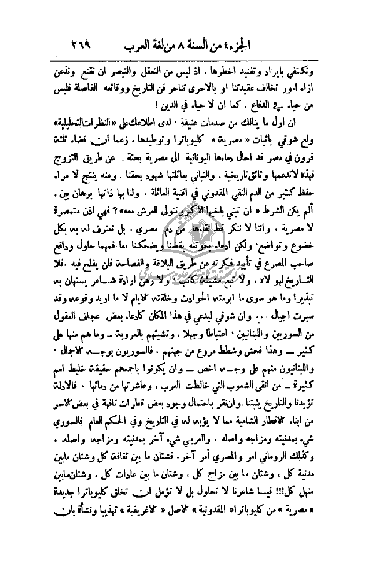 فالسوريون بوجه الإجمال، واللبنانيون منهم على وجه أخص - وان يكونوا بأجمعهم حقيقة خليط أمم كثيرة - من أنقى الشعوب التي خالطت العرب، وعاشرتها من دماءها، فالأدلة تؤيدنا والتاريخ يثبتنا، وان نقر باحتمال وجود بعض قطرات تافهة في بعض الأسر من أبناء الأقطار الشامية مما لا يؤبه له في التاريخ وفي الحكم العام فالسوري سيئ بمدنيته ومزاجه واصله. والعربي شيء آخر بمدنيته ومزاجه واصله. وكذلك الروماني أمر والمصري أمر آخر. فشتان ما بين ثقافة كل وشتان ما بين مدنية كل، وشتان ما بيم مزاج كل، وشتان ما بين عادات كل، وشتان ما بين منهل كل!!! فيا شاعرنا لا تحاول بل لا تؤمل أن تخلق كليوباترا جديدة (مصرية) من كليوباترا (المقدونية) الأصل (الإغريقية) تهذيبا ونشأة بان