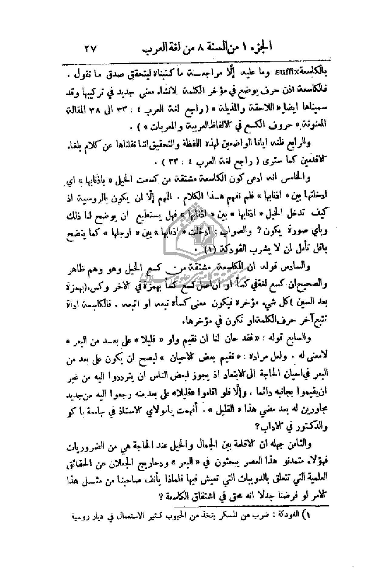 بالكلسعة وما عليه إلا مراجعة ما كتبناه ليتحقق صدق ما نقول. فبالكالسعة أذن حرف يوضع في مؤخر الكلمة لإنشاء معنى جديد في تركيبها وقد سميناها أيضاً (اللاحقة والمذيلة) (راجع لغة العرب 33: 4 إلى 38 المقالة المعنونة (حروف الكسع في الألفاظ العربية والمعربات).