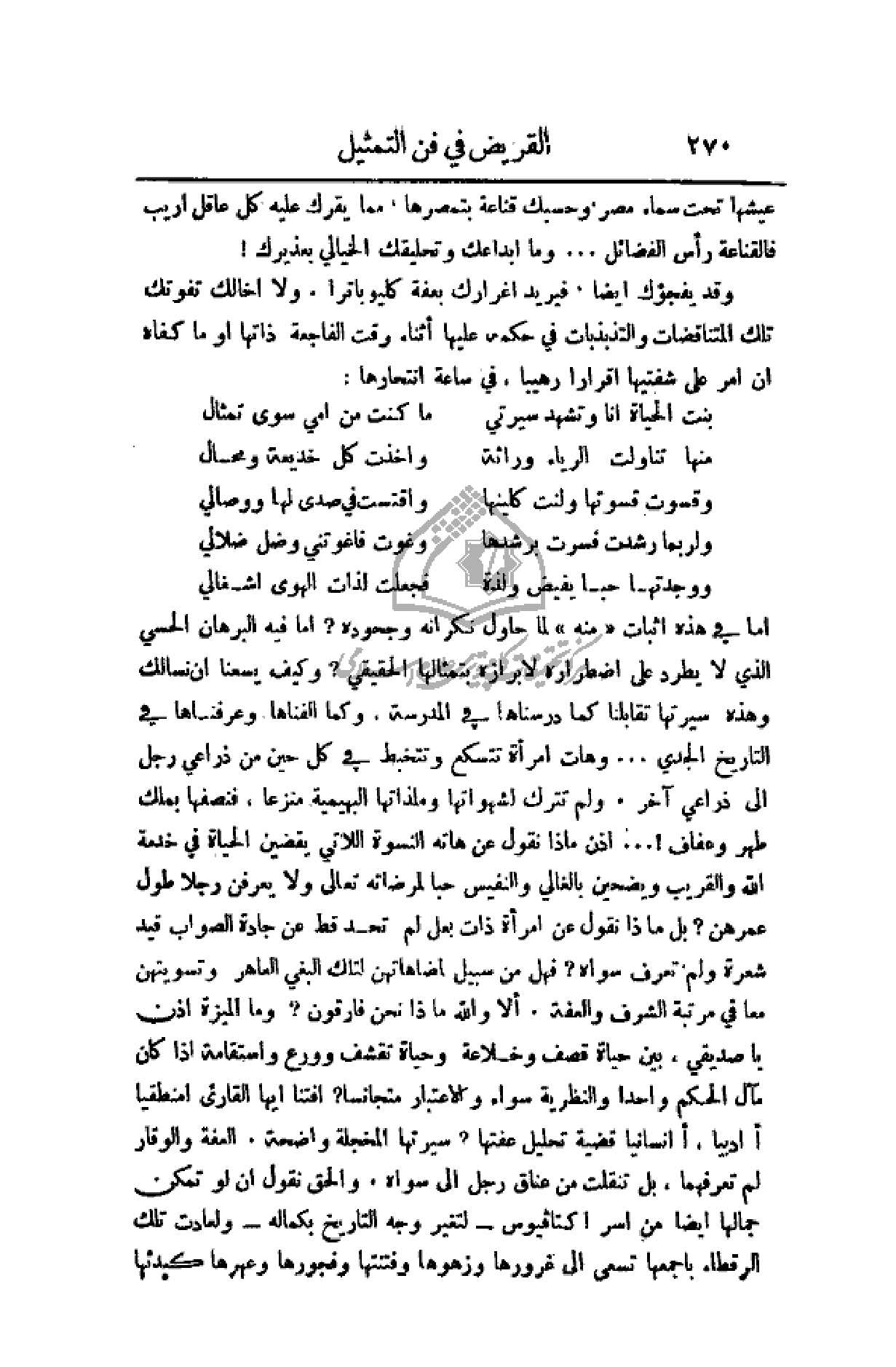 الصواب قيد شعرة ولم تعرف سواه؟ فهل من سبيل لمضاهاتهن لتلك البغي العاهر وتسويتهن معا في مرتبة الشرف والعفة، ألا والله ماذا نحن فارقون؟ وما الميزة إذن يا صديقي، بين حياة قصف وخلاعة وحياة تقشف وورع واستقامة إذا كان مآل الحكم واحدا والنظرية سواء والاعتبار متجانسا؟ افتنا أيها القارئ أمنطقيا أأدبيا، اإنسانيا قضية تحليل عفتها؟ سيرتها المخجلة واضحة، العفة والوقار لم تعرفهما، بل تنقلت من عناق رجل إلى سواه، والحق نقول أن لو تمكن جمالها أيضاً من أسر اكتافيوس - لتغير وجه التاريخ بكماله - ولعادت تلك الرقطاء بأجمعها تسعى إلى غرورها وزهوها وفتنتها وفجورها وعهرها كبدئها