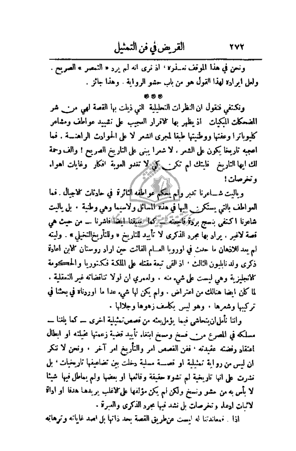 وإننا نأمل أن يتحاشى فيما يؤمل بعثه من قصص تمثيلية أخرى - كما بلغنا - مسلكه في المصرع من فسخ ومسخ ابتغاء تأييد قضية زعمتها مخيلته أو أبطال اعتقاد رفضته عقيدته، ففن القصص ارم والتاريخ أمر آخر. ونحن لا ننكر أن ليس من رواية تمثيلية أو قصة مسلية دخلت بين تضاعيفها تاريخيات، بل نشرت على إنها تاريخية لم تشوه حقيقة