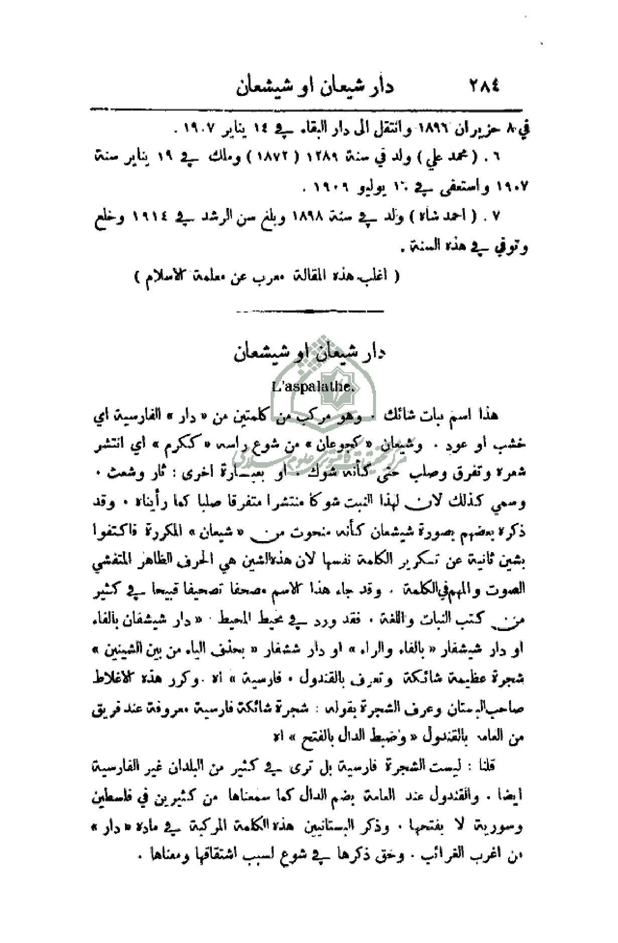 هذا اسم نبات شائك، وهو مركب من كلمتين من (دار) الفارسية أي خشب أو عود، وشيعان (كجوعان) من شوع رأسه (ككرم) أي انتشر شعره وتفرق وصلب حتى كأنه شوك، أو بعبارة أخرى: ثار وشعث. وسمي كذلك لان لهذا النبت شوكا منتشرا متفرقا صلبا كما رأيناه، وقد ذكره بعضهم بصورة شيشعان كأنه منحوت من (شيعان) المكررة فاكتفوا بشين ثانية عن تكرير الكلمة نفسها لان هذه الشين هي الحرف الظاهر المتفشي الصوت والمهم في الكلمة. وقد جاء هذا الاسم مصحفا تصحيفا قبيحا في كثير من كتب النبات واللغة، فقد ورد في محيط المحيط (دار شيشفان بالفاء أو دار شيشفار) (بالفاء والراء) أو دار ششفار (بحذف الياء من بين الشينين) شجرة عظيمة شائكة وتعرف بالقندول، (فارسية) اه. وكرر هذه الأغلاط صاحب البستان وعرف الشجرة بقوله: شجرة شائكة فارسية معروفة عند فريق من العامة بالقندول (وضبط الدال بالفتح) اه.