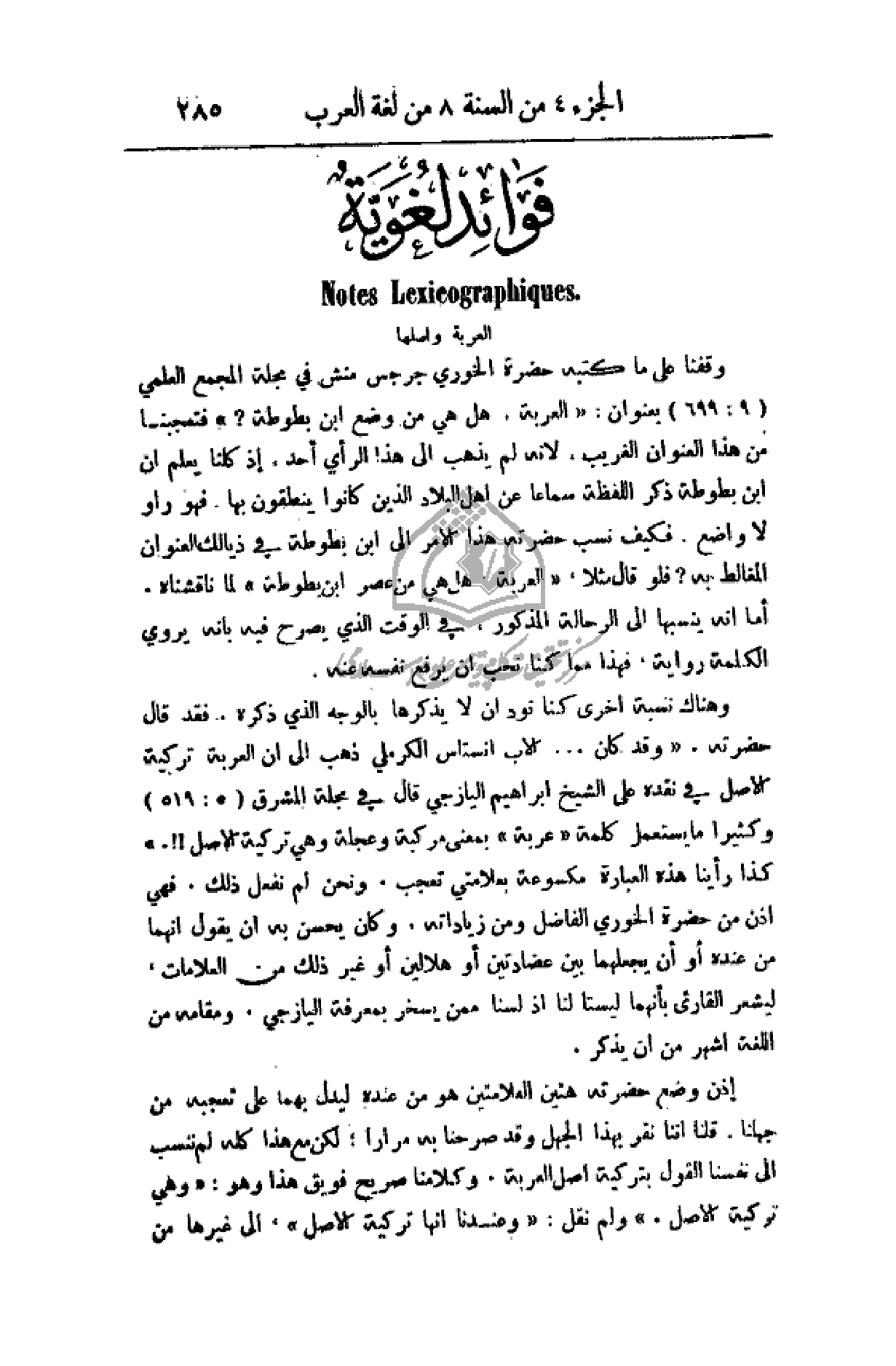 وقفنا على ما كتبه حضرة الخوري جرجس منش في مجلة المجمع العلمي (699: 9) بعنوان: (العربة، هل هي من وضع ابن بطوطة؟) فتعجبنا من هذا العنوان الغريب، لأنه لم يذهب إلى هذا الرأي أحد، إذ كلنا يعلم أن ابن بطوطة ذكر اللفظة سماعا عن أهل البلاد الذين كانوا ينطقون بها فهو راو لا واضع، فكيف نسب حضرته هذا الأمر إلى ابن بطوطة في ذيالك العنوان المغالط به؟ فلو قال مثلا: (العربة، هل هي من عصر ابن بطوطة) لما ناقشناه. أما انه ينسبها إلى الرحالة المذكور، في الوقت الذي يصرح فيه بأنه يروي الكلمة رواية، فهذا مما كنا نحب أن يرفع نفسه عنه.