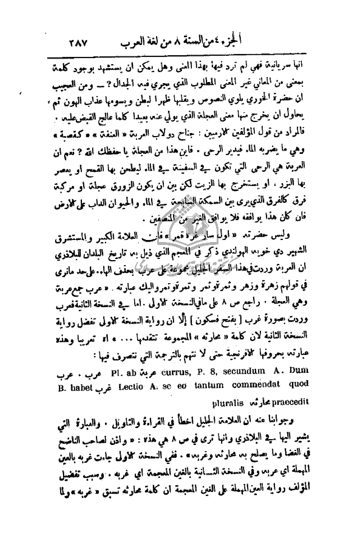 وجوابنا عنه أن العلامة الجليل أخطأ في القراءة والتأويل. والعبارة التي يشير إليها في البلاذري وأنها ترى في ص8 هي هذه: (وإذن لصاحب الناضح في الغضا وما يصلح به محارثه وغربه). ففي النسخة الأولى جاءت غربة بالعين المهملة أي عربه وفي النسخة الثانية بالغين المعجمة أي غربه. وسبب تفضيل المؤلف رواية العين المهملة على الغين المعجمة أن كلمة محارثه تسبق (غربه) ولما